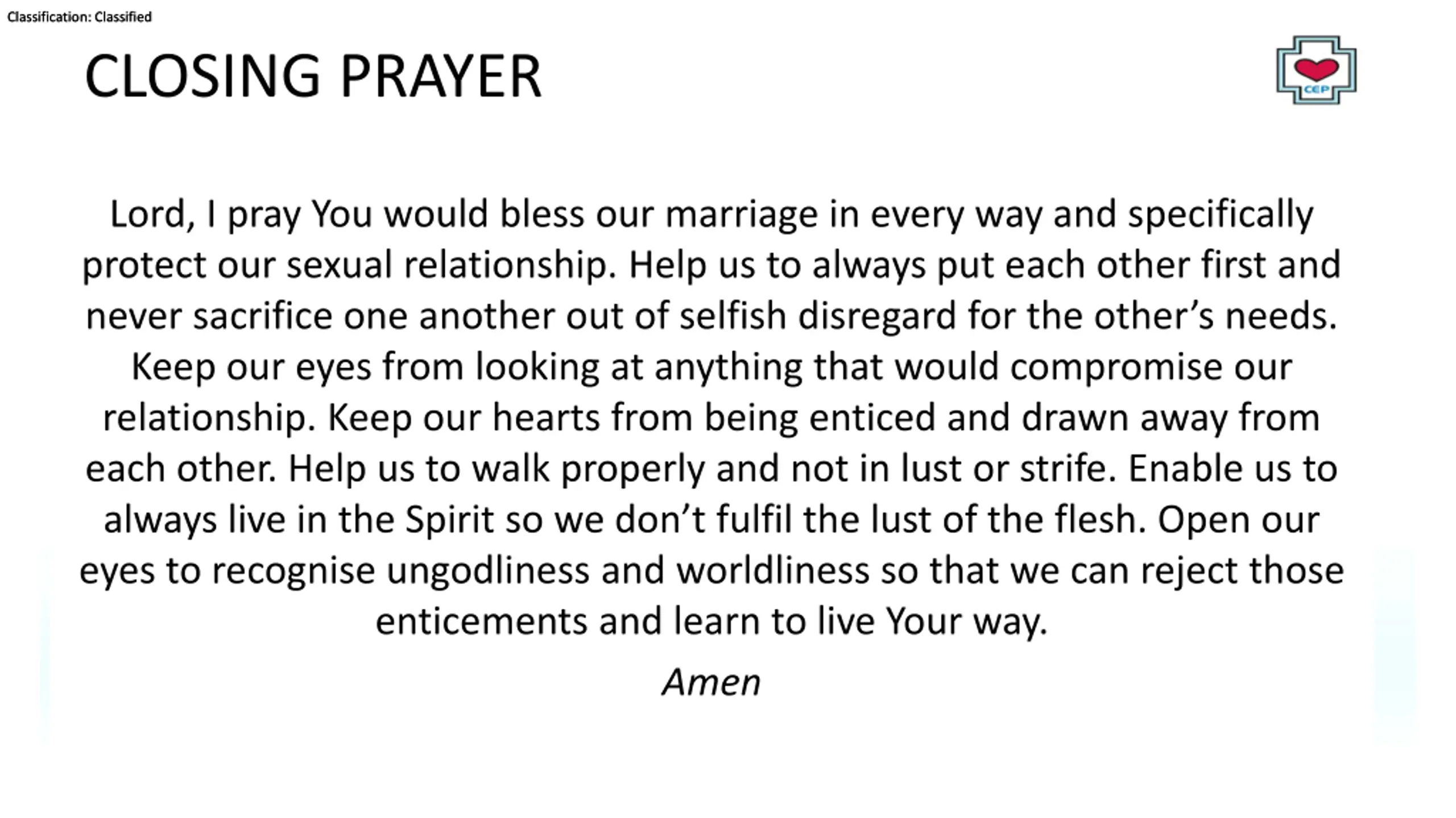 Classification: Classified Classification: Classified CLOSING PRAYER Lord, I pray You would bless our marriage in every way and specifically protect our sexual relationship. Help us to always put each other first and never sacrifice one another out of selfish disregard for the other s needs. Keep our eyes from looking at anything that would compromise our relationship. Keep our hearts from being enticed and drawn away from each other. Help us to walk properly and not in lust or strife. Enable us to always live in the Spirit so we don t fulfil the lust of the flesh. Open our eyes to recognise ungodliness and worldliness so that we can reject those enticements and learn to live Your way. Amen