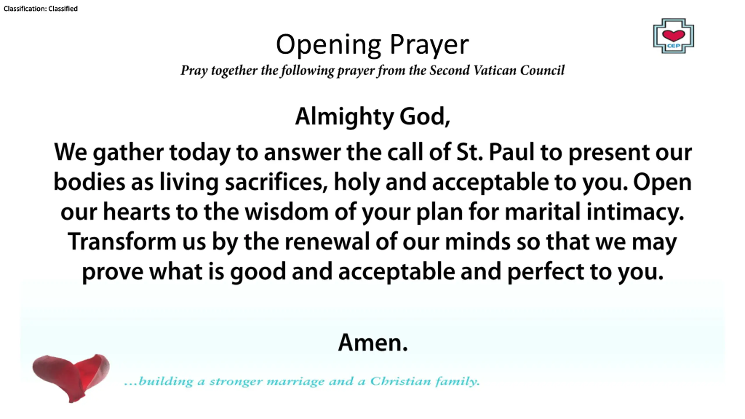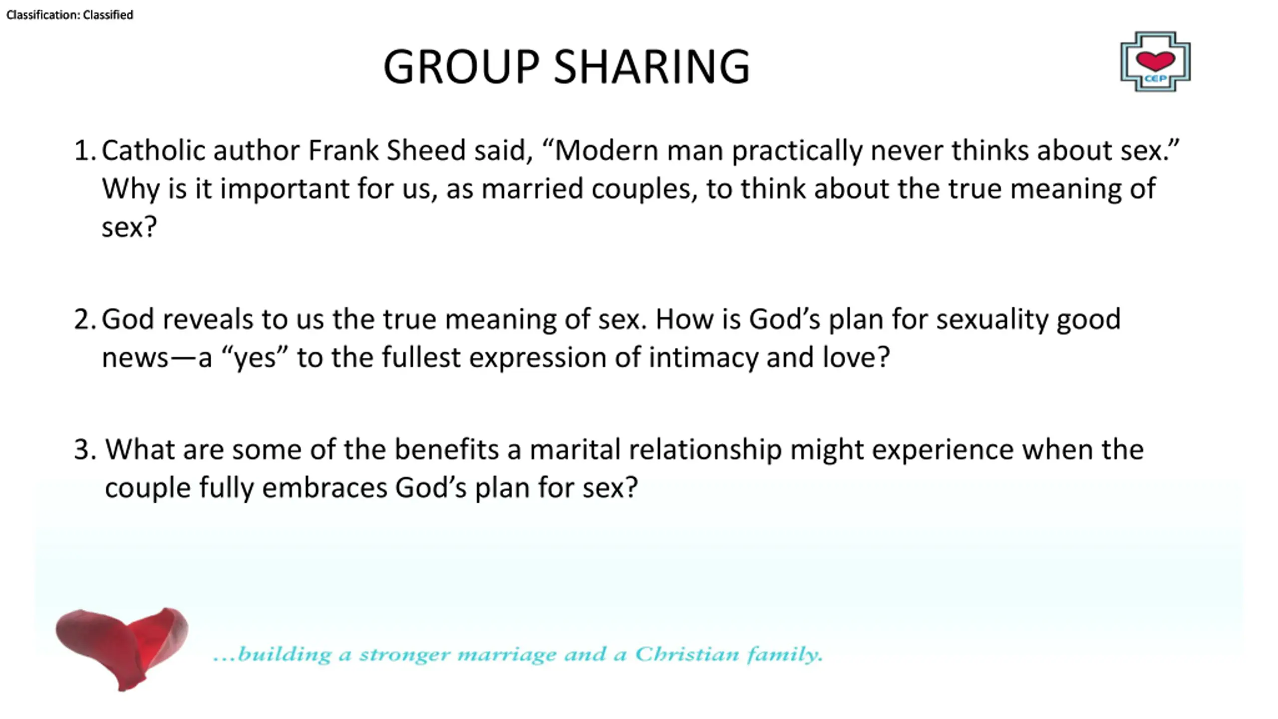 Classification: Classified Classification: Classified GROUP SHARING 1.Catholic author Frank Sheed said, Modern man practically never thinks about sex. Why is it important for us, as married couples, to think about the true meaning of sex? 2.God reveals to us the true meaning of sex. How is God s plan for sexuality good news a yes to the fullest expression of intimacy and love? 3. What are some of the benefits a marital relationship might experience when the couple fully embraces God s plan for sex?