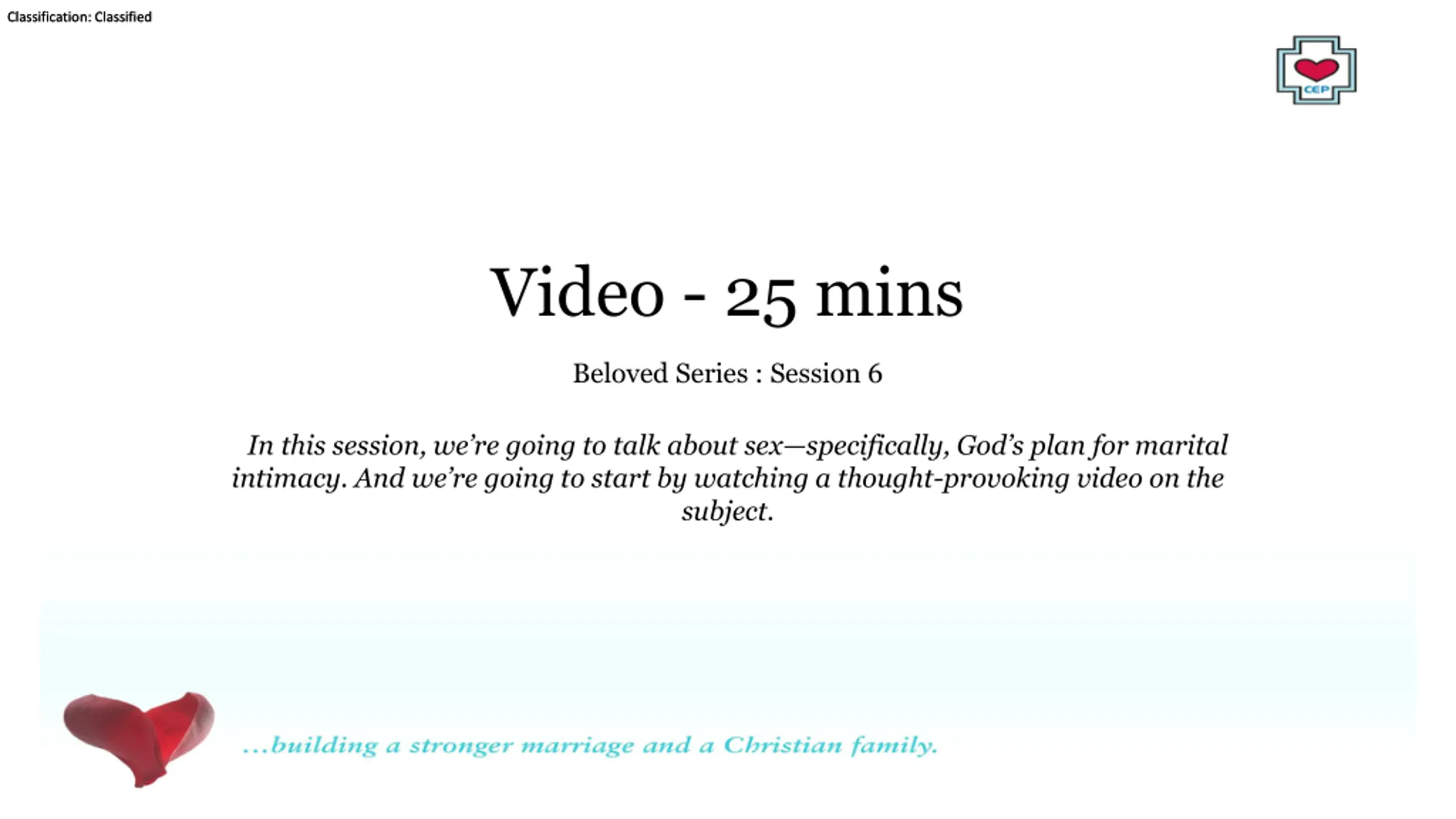 Classification: Classified Classification: Classified Video - 25 mins Beloved Series : Session 6 In this session, we re going to talk about sex specifically, God s plan for marital intimacy. And we re going to start by watching a thought-provoking video on the subject.