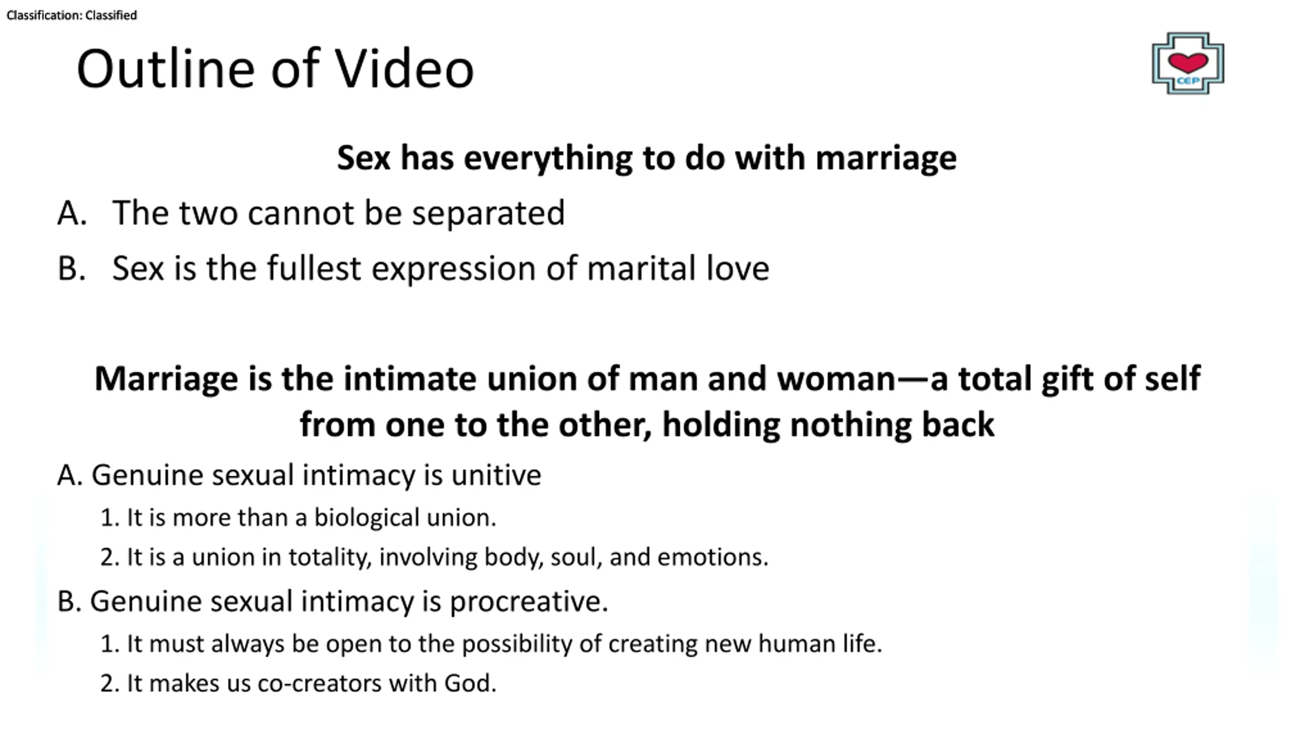 Classification: Classified Classification: Classified Outline of Video Sex has everything to do with marriage A. The two cannot be separated B. Sex is the fullest expression of marital love Marriage is the intimate union of man and woman a total gift of self from one to the other, holding nothing back A. Genuine sexual intimacy is unitive 1. It is more than a biological union. 2. It is a union in totality, involving body, soul, and emotions. B. Genuine sexual intimacy is procreative. 1. It must always be open to the possibility of creating new human life. 2. It makes us co-creators with God.