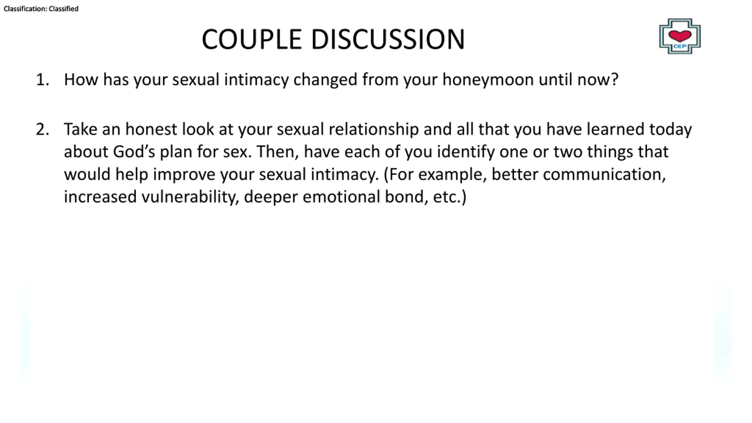 Classification: Classified Classification: Classified COUPLE DISCUSSION 1. How has your sexual intimacy changed from your honeymoon until now? 2. Take an honest look at your sexual relationship and all that you have learned today about God s plan for sex. Then, have each of you identify one or two things that would help improve your sexual intimacy. (For example, better communication, increased vulnerability, deeper emotional bond, etc.)