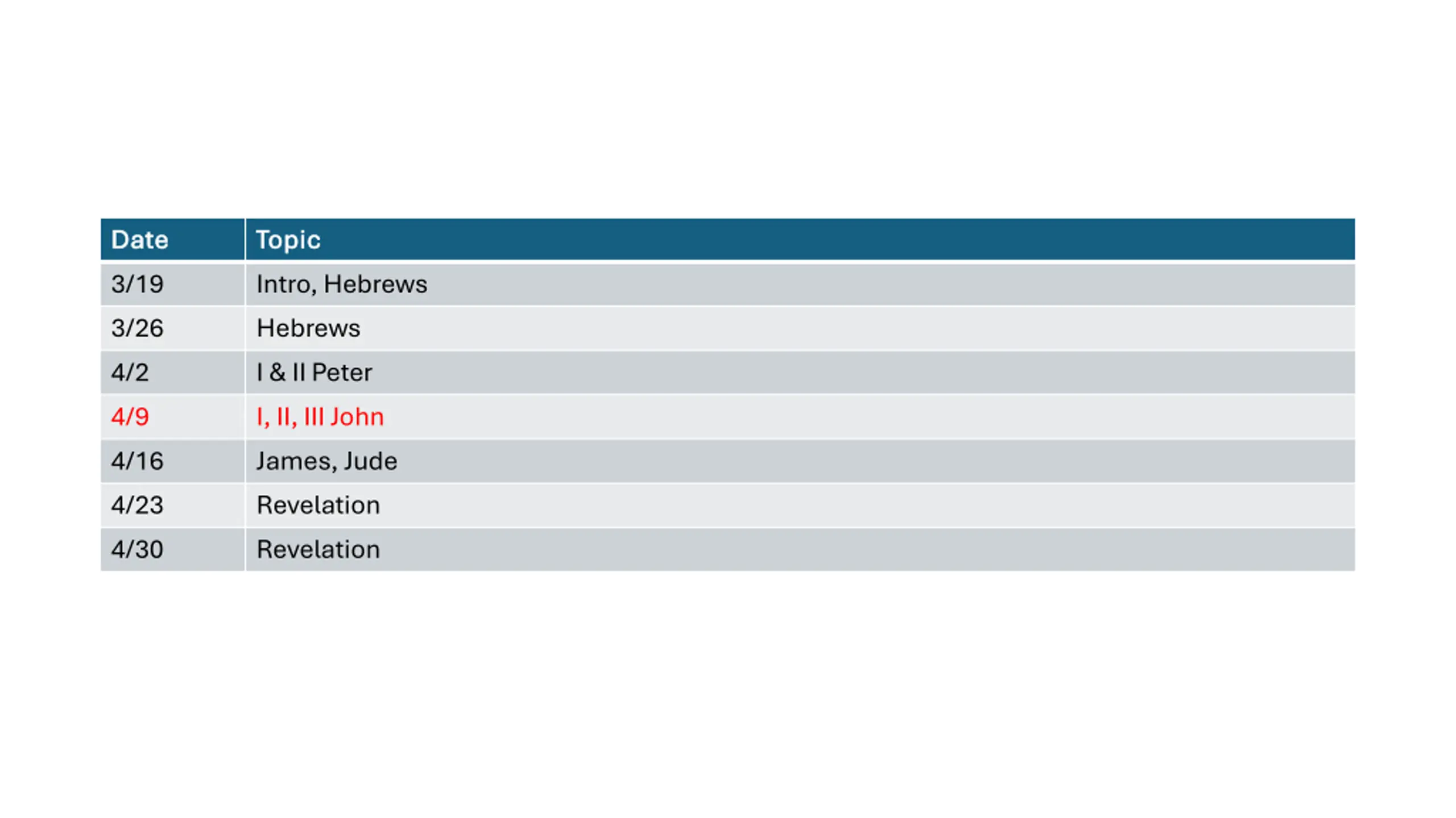 Date Date 3/19 3/26 4/2 4/9 4/16 4/23 4/30 Topic Topic Intro, Hebrews Hebrews I & II Peter I, II, III John James, Jude Revelation Revelation