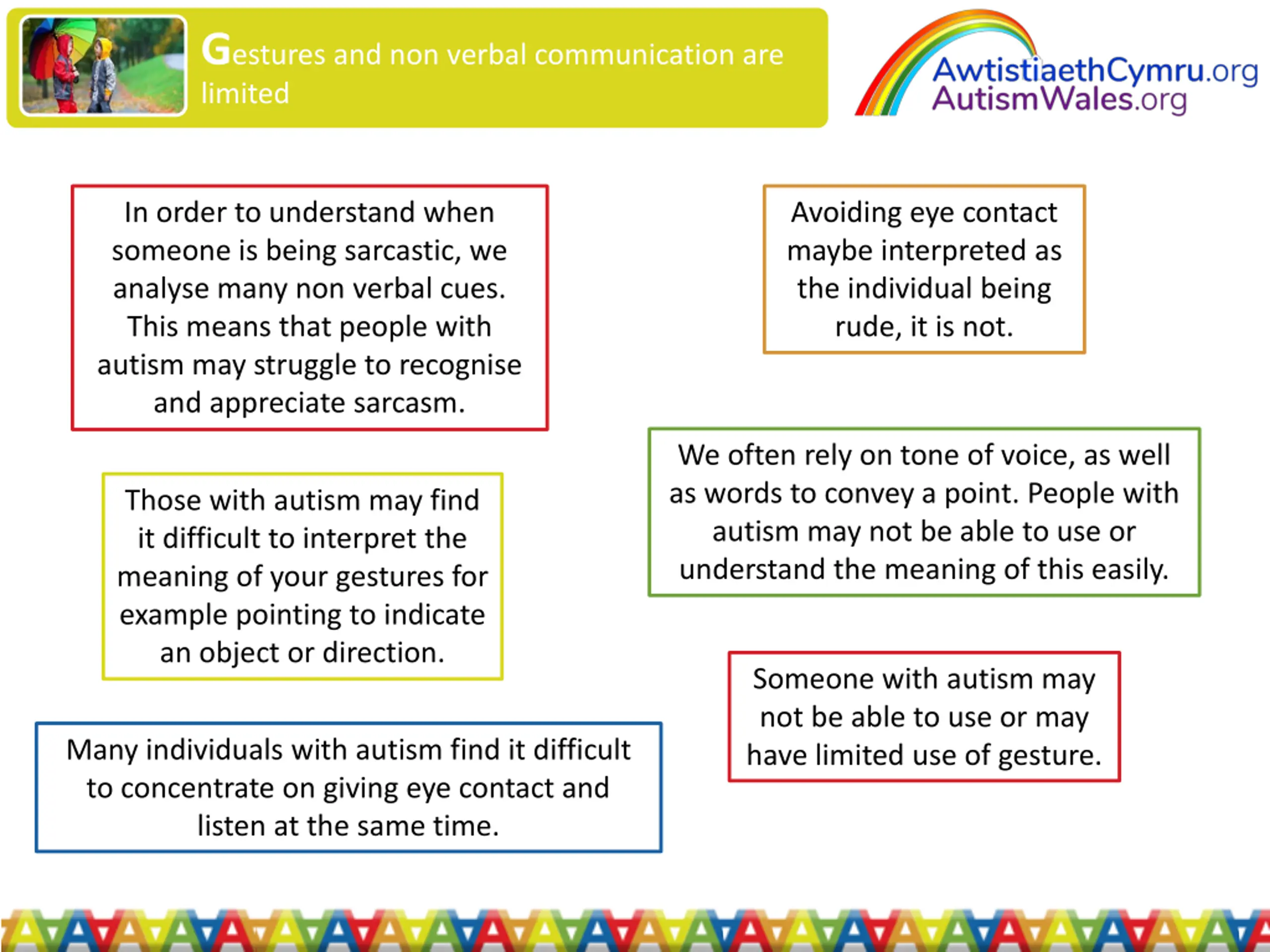 Gestures and non verbal communication are limited In order to understand when someone is being sarcastic, we analyse many non verbal cues. This means that people with autism may struggle to recognise and appreciate sarcasm. Avoiding eye contact maybe interpreted as the individual being rude, it is not. We often rely on tone of voice, as well as words to convey a point. People with autism may not be able to use or understand the meaning of this easily. Those with autism may find it difficult to interpret the meaning of your gestures for example pointing to indicate an object or direction. Someone with autism may not be able to use or may have limited use of gesture. Many individuals with autism find it difficult to concentrate on giving eye contact and listen at the same time.
