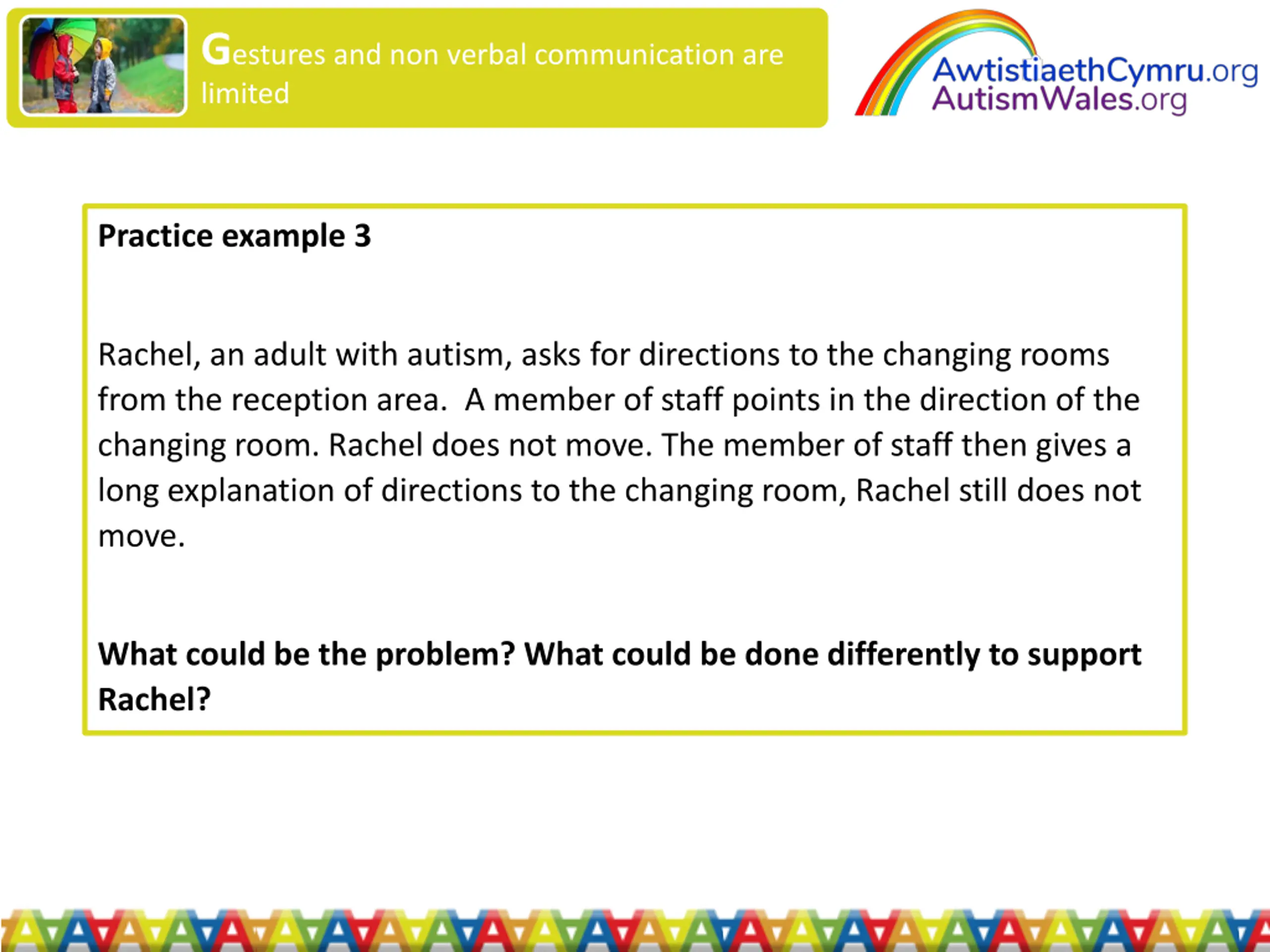 Gestures and non verbal communication are limited Practice example 3 Rachel, an adult with autism, asks for directions to the changing rooms from the reception area. A member of staff points in the direction of the changing room. Rachel does not move. The member of staff then gives a long explanation of directions to the changing room, Rachel still does not move. What could be the problem? What could be done differently to support Rachel?