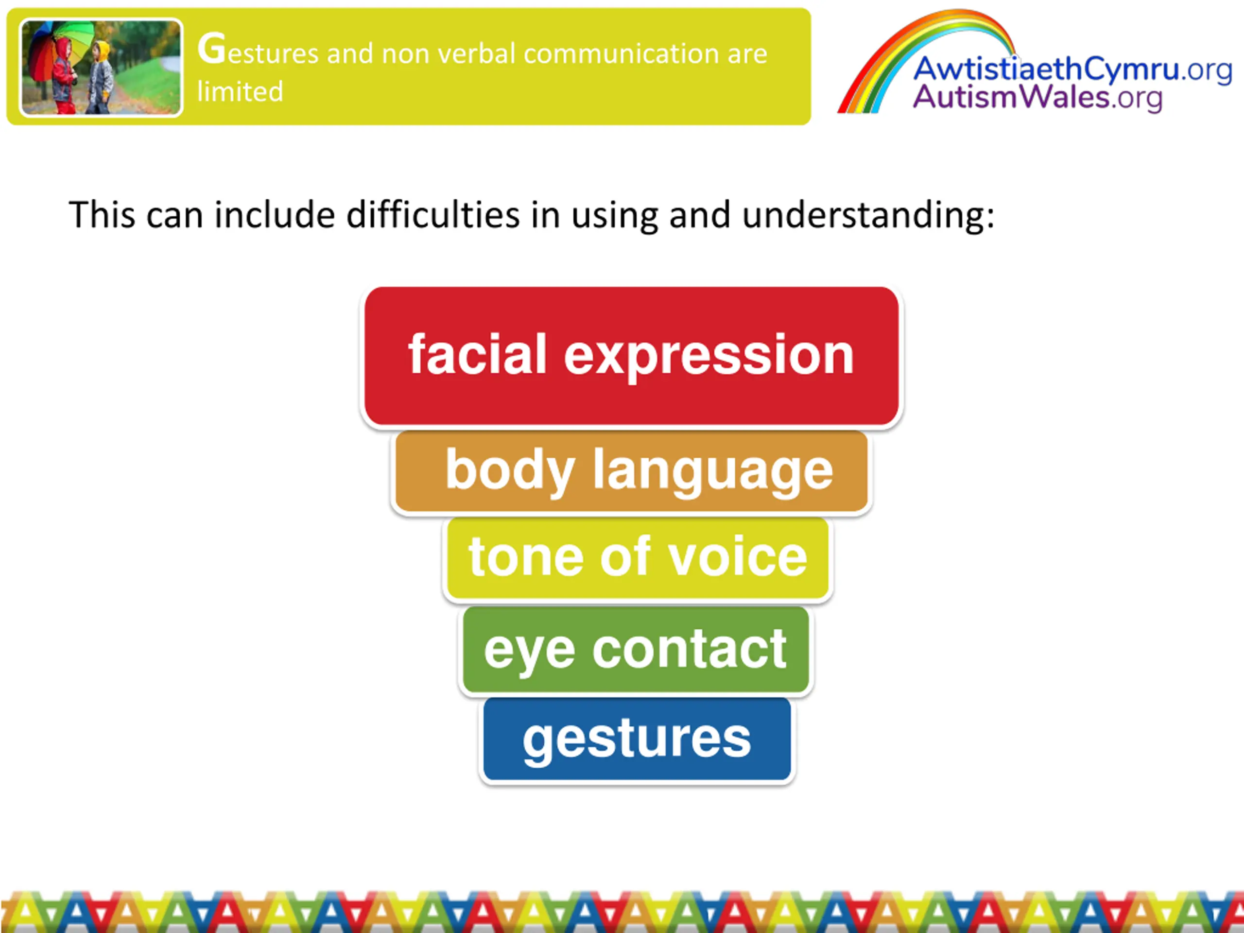 Gestures and non verbal communication are limited This can include difficulties in using and understanding: facial expression body language tone of voice eye contact gestures