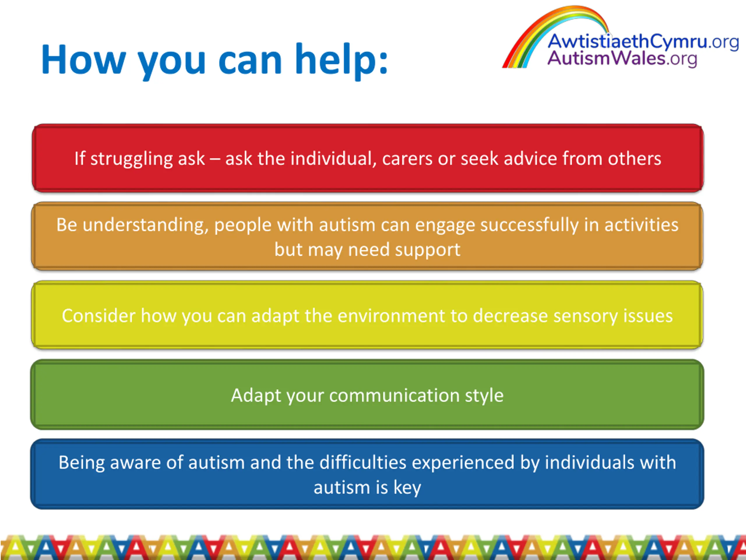 How you can help: If struggling ask ask the individual, carers or seek advice from others Be understanding, people with autism can engage successfully in activities but may need support Consider how you can adapt the environment to decrease sensory issues Adapt your communication style Being aware of autism and the difficulties experienced by individuals with autism is key