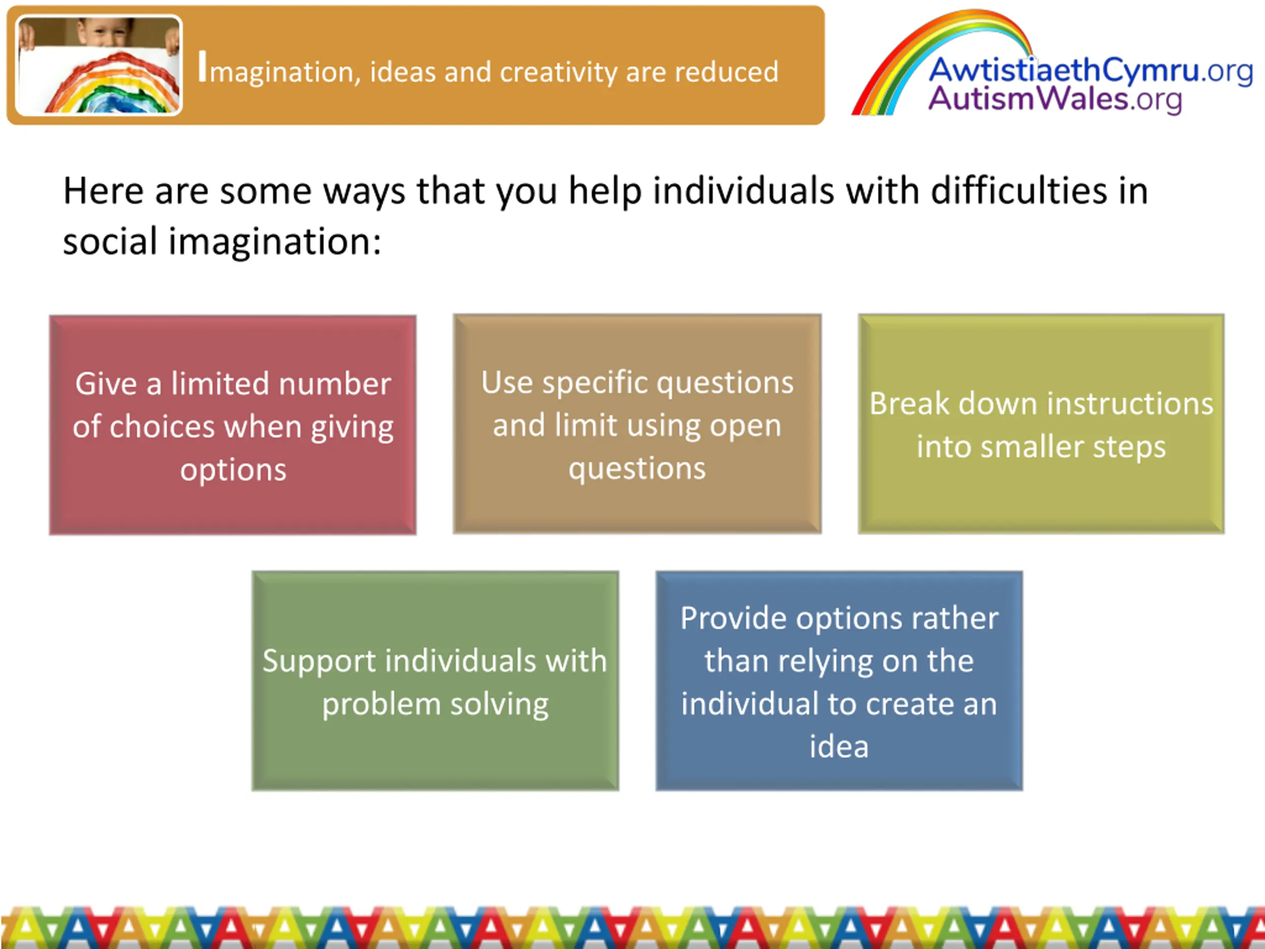 Imagination, ideas and creativity are reduced Here are some ways that you help individuals with difficulties in social imagination: Use specific questions and limit using open questions Give a limited number of choices when giving options Break down instructions into smaller steps Provide options rather than relying on the individual to create an idea Support individuals with problem solving
