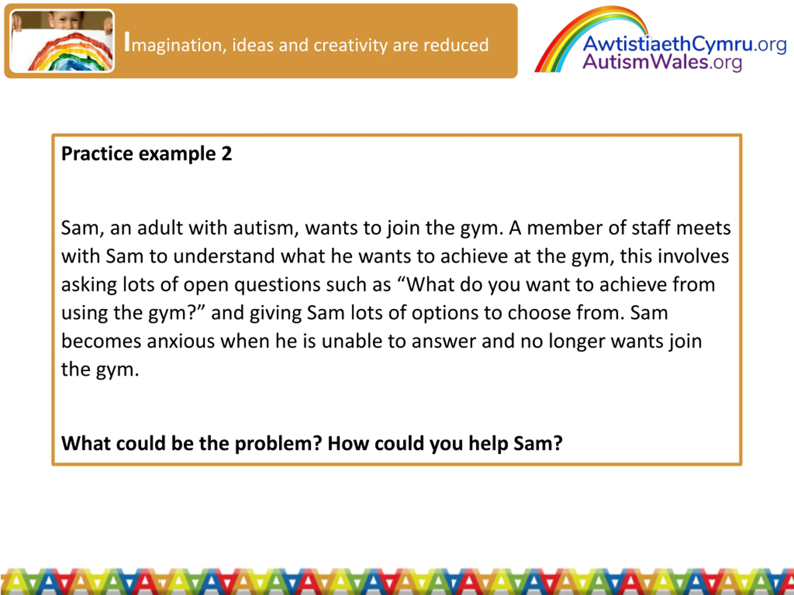 Imagination, ideas and creativity are reduced Practice example 2 Sam, an adult with autism, wants to join the gym. A member of staff meets with Sam to understand what he wants to achieve at the gym, this involves asking lots of open questions such as What do you want to achieve from using the gym? and giving Sam lots of options to choose from. Sam becomes anxious when he is unable to answer and no longer wants join the gym. What could be the problem? How could you help Sam?