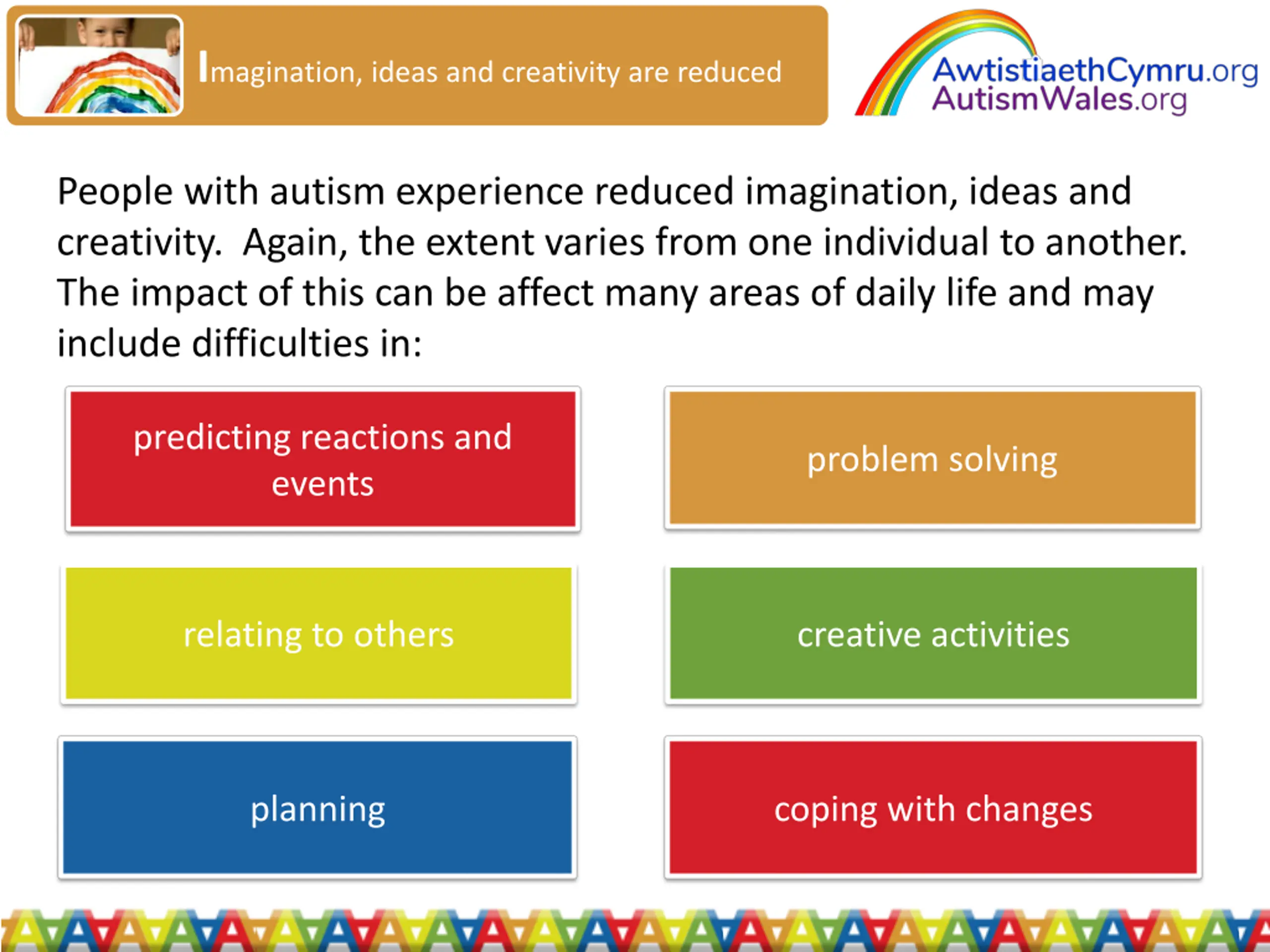 Imagination, ideas and creativity are reduced How this impacts on day to day life: Playing team games often relies on social imagination to predict how other people will interact in the game. This can be difficult for people with autism. When problem solving, we rely on our social imagination to predict possible outcomes. This is difficult for someone with autism. Some people with autism have difficulties with creative imagination. Others have good creative imagination, and only the social imagination is affected. Often making free choices or generating creative ideas is difficult. Planning can be difficult without good social imagination, people with autism often rely on calendars or planners to help them with this. Coping with changes can be difficult without good social imagination. People with autism usually prefer routines to unpredictability.