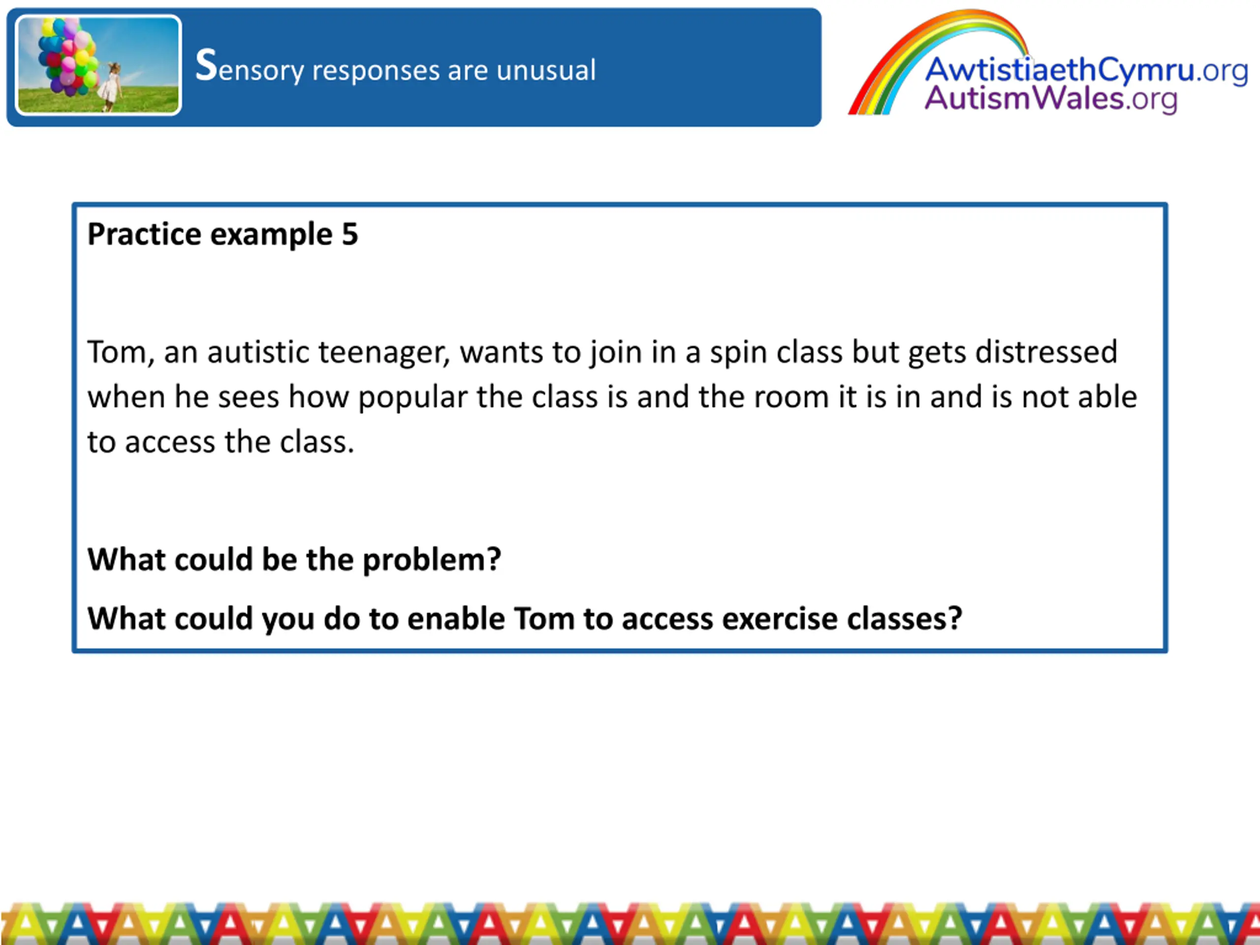 Sensory responses are unusual Practice example 5 Tom, an autistic teenager, wants to join in a spin class but gets distressed when he sees how popular the class is and the room it is in and is not able to access the class. What could be the problem? What could you do to enable Tom to access exercise classes?