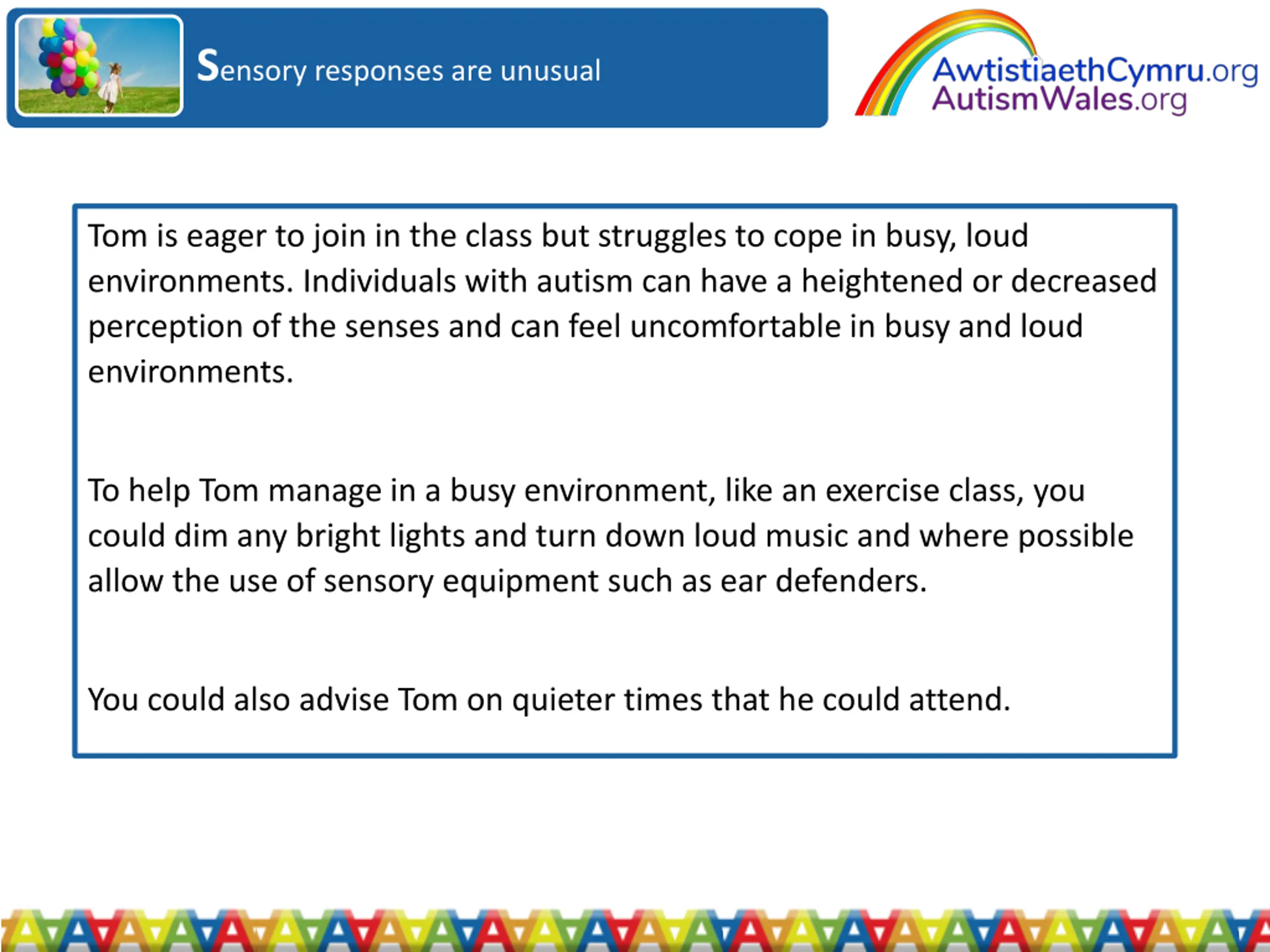 Sensory responses are unusual Tom is eager to join in the class but struggles to cope in busy, loud environments. Individuals with autism can have a heightened or decreased perception of the senses and can feel uncomfortable in busy and loud environments. To help Tom manage in a busy environment, like an exercise class, you could dim any bright lights and turn down loud music and where possible allow the use of sensory equipment such as ear defenders. You could also advise Tom on quieter times that he could attend.