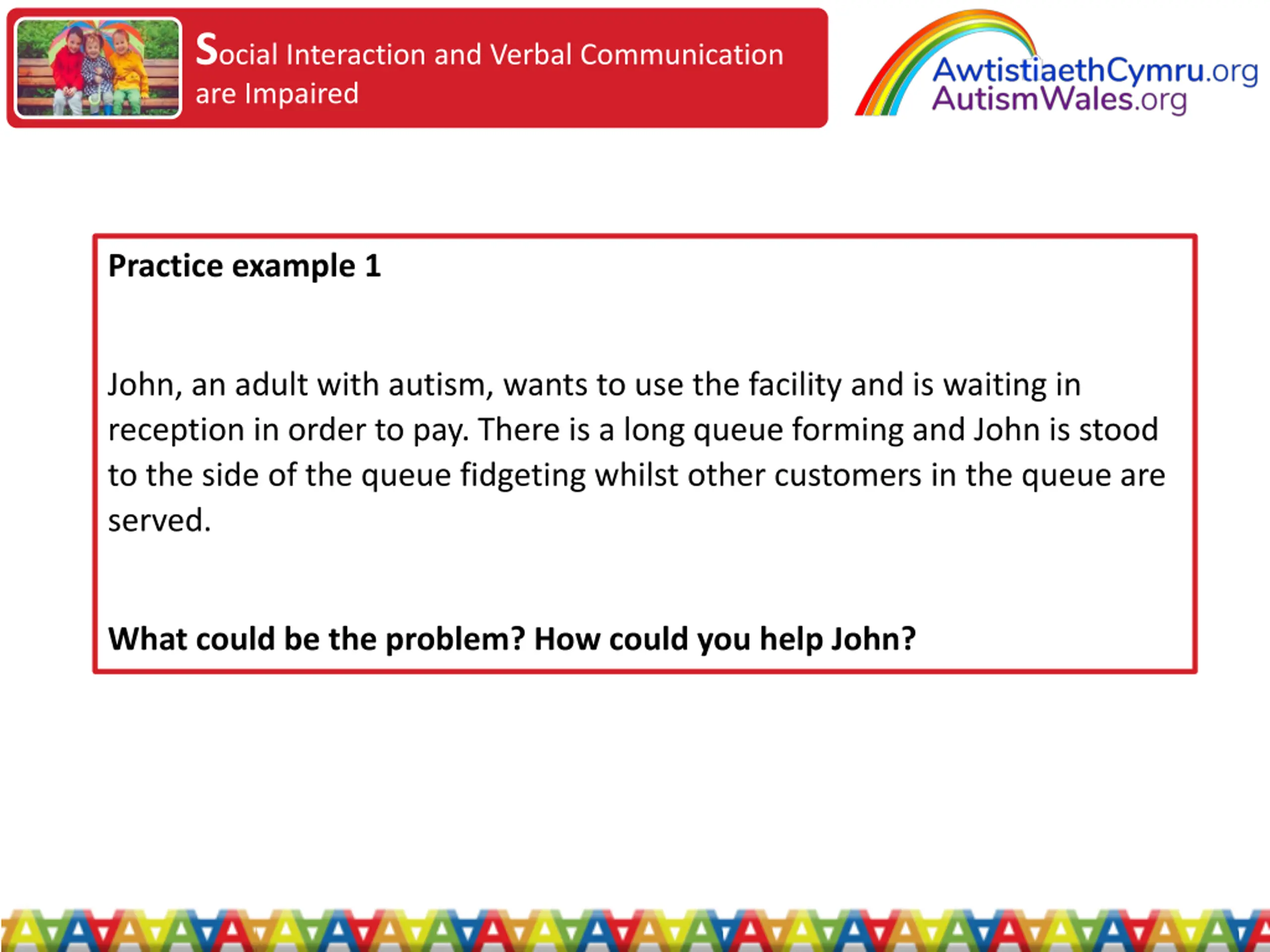 Social Interaction and Verbal Communication are Impaired Practice example 1 John, an adult with autism, wants to use the facility and is waiting in reception in order to pay. There is a long queue forming and John is stood to the side of the queue fidgeting whilst other customers in the queue are served. What could be the problem? How could you help John?