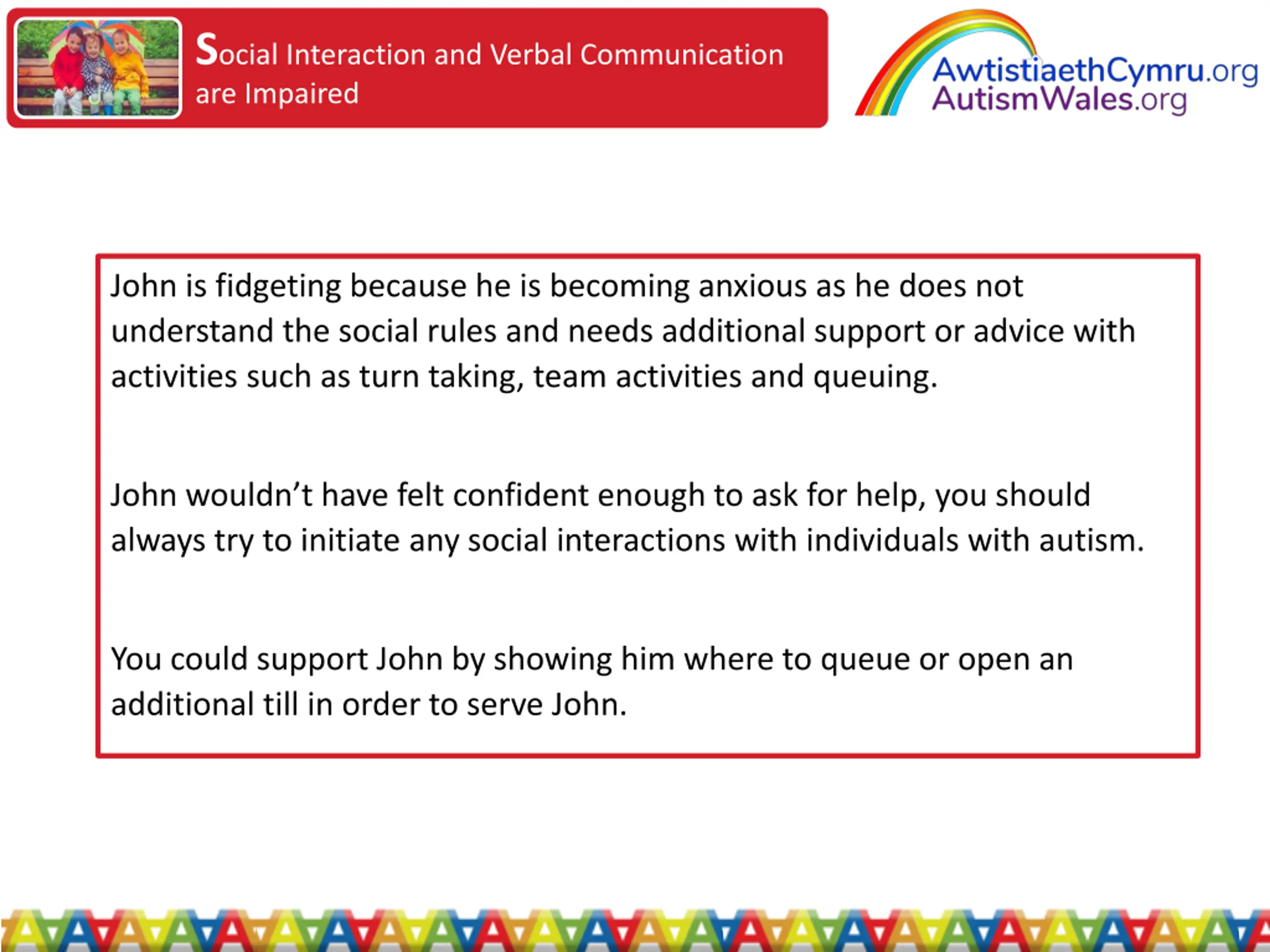 Social Interaction and Verbal Communication are Impaired John is fidgeting because he is becoming anxious as he does not understand the social rules and needs additional support or advice with activities such as turn taking, team activities and queuing. John wouldn t have felt confident enough to ask for help, you should always try to initiate any social interactions with individuals with autism. You could support John by showing him where to queue or open an additional till in order to serve John.