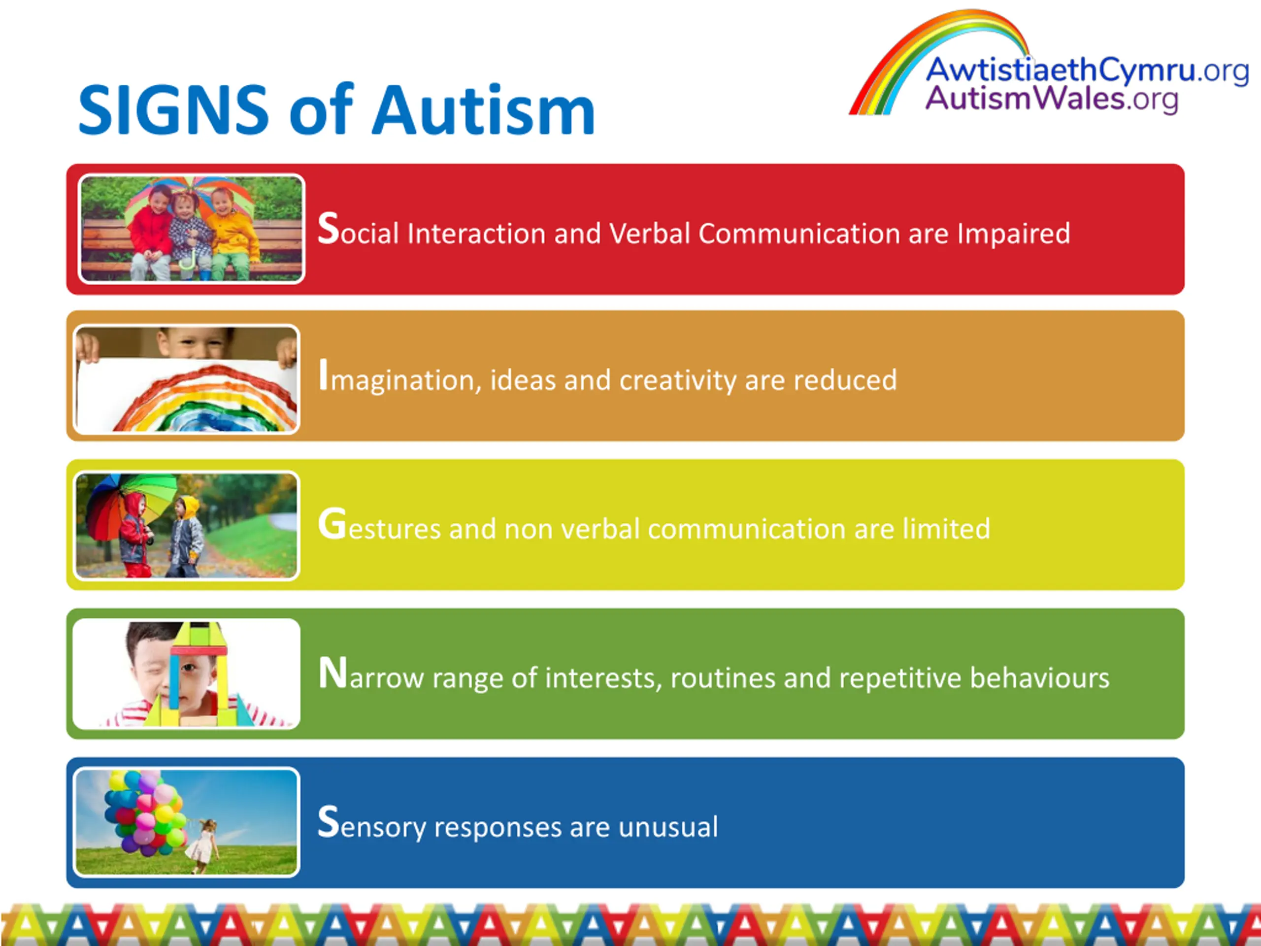 SIGNS of Autism Social Interaction and Verbal Communication are Impaired Imagination, ideas and creativity are reduced Gestures and non verbal communication are limited Narrow range of interests, routines and repetitive behaviours Sensory responses are unusual