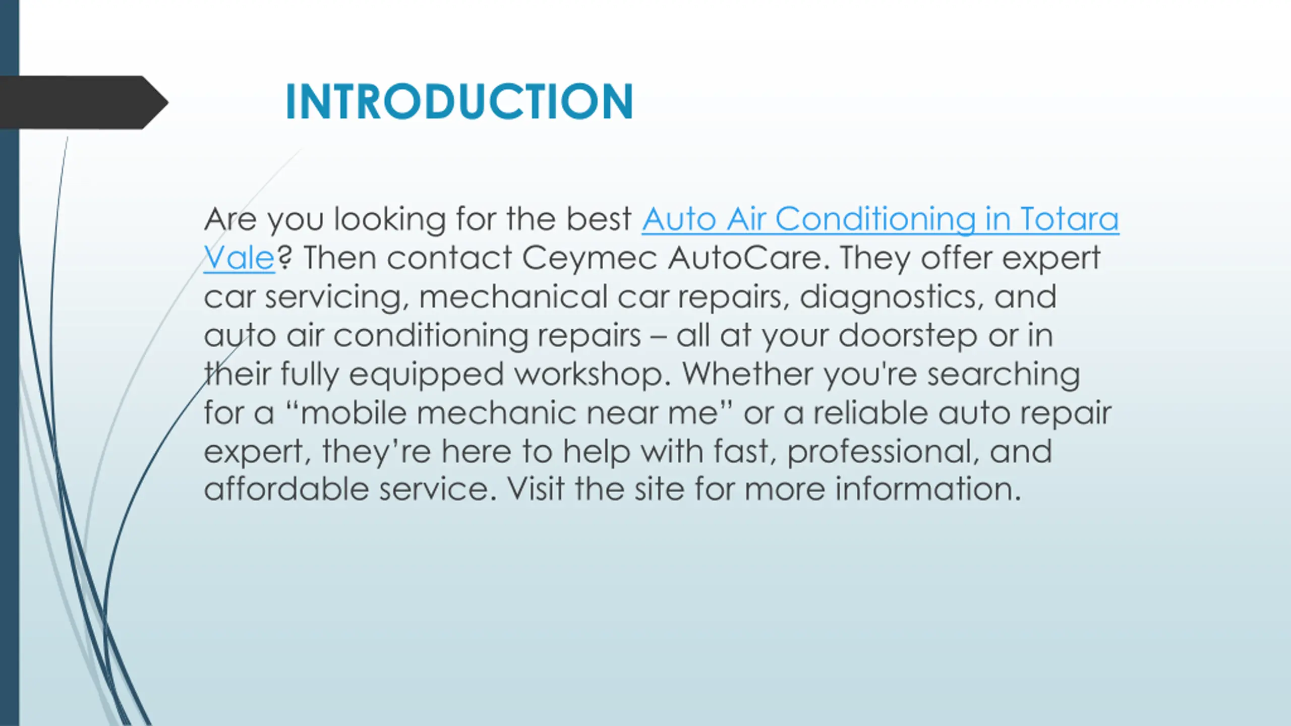 INTRODUCTION Are you looking for the best Auto Air Conditioning in Totara Vale? Then contact Ceymec AutoCare. They offer expert car servicing, mechanical car repairs, diagnostics, and auto air conditioning repairs all at your doorstep or in their fully equipped workshop. Whether you're searching for a mobile mechanic near me or a reliable auto repair expert, they re here to help with fast, professional, and affordable service. Visit the site for more information.