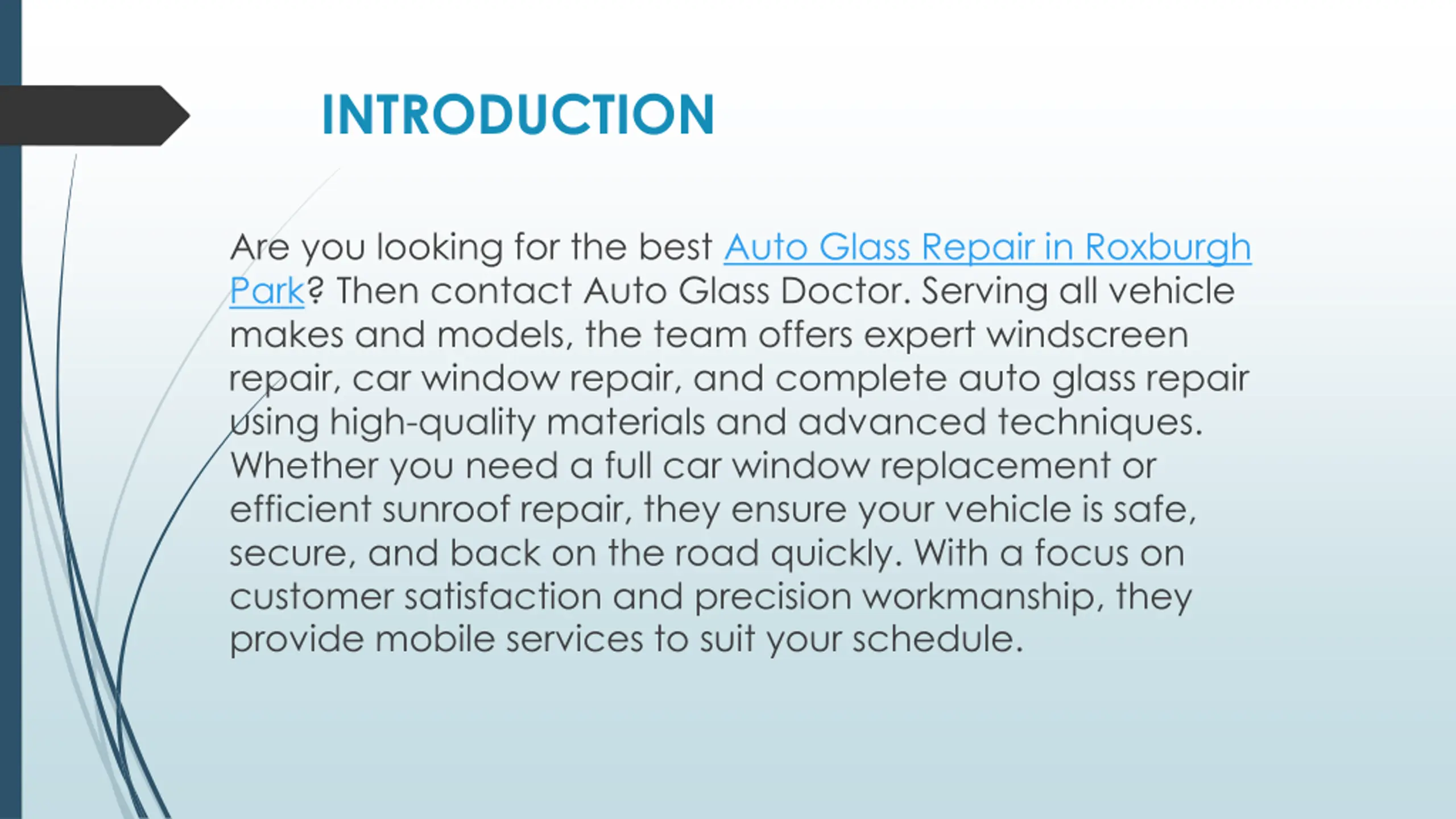 INTRODUCTION Are you looking for the best Auto Glass Repair in Roxburgh Park? Then contact Auto Glass Doctor. Serving all vehicle makes and models, the team offers expert windscreen repair, car window repair, and complete auto glass repair using high-quality materials and advanced techniques. Whether you need a full car window replacement or efficient sunroof repair, they ensure your vehicle is safe, secure, and back on the road quickly. With a focus on customer satisfaction and precision workmanship, they provide mobile services to suit your schedule.