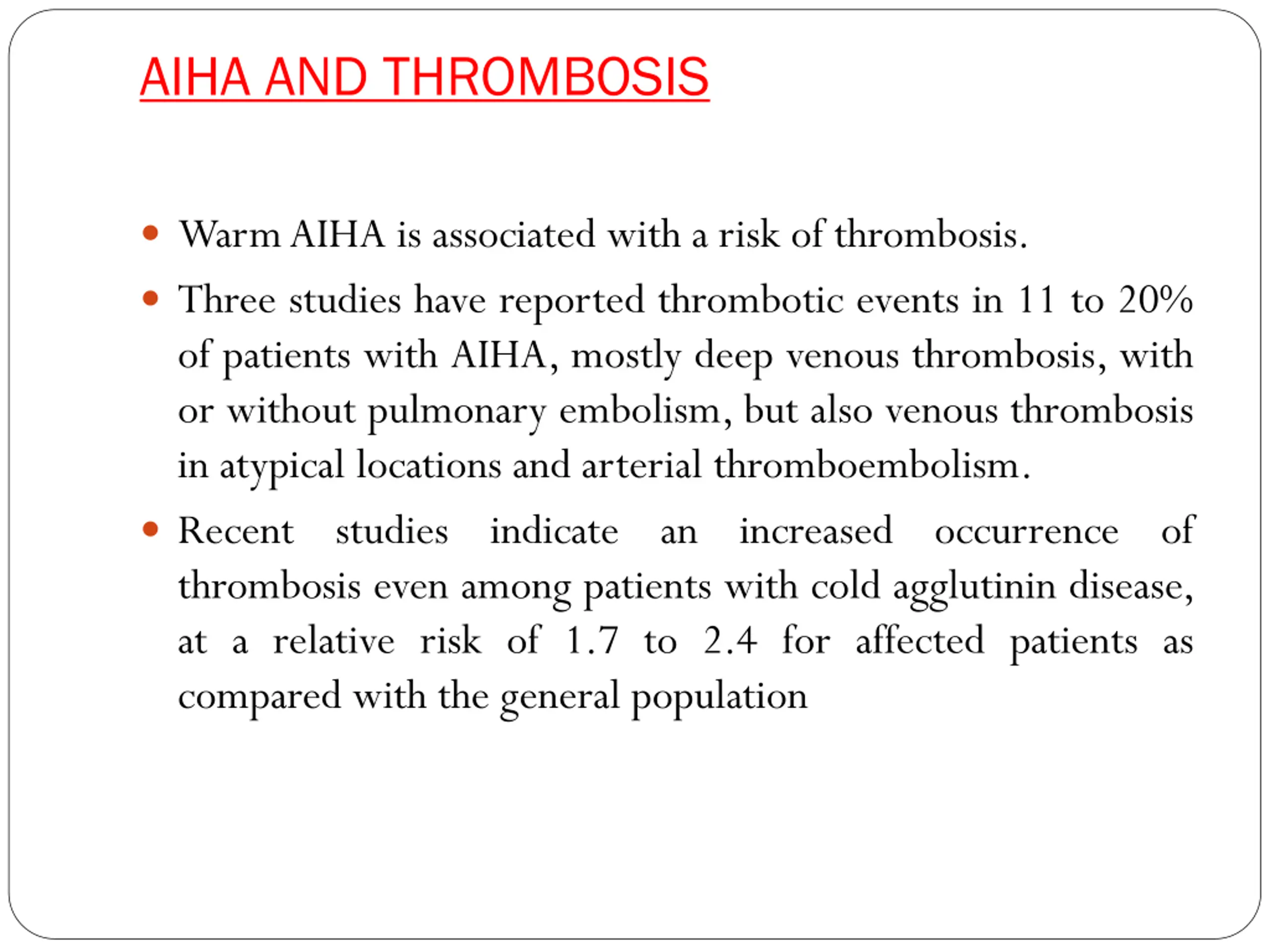 AIHA AND THROMBOSIS WarmAIHA is associated with a risk of thrombosis. Three studies have reported thrombotic events in 11 to 20% of patients with AIHA, mostly deep venous thrombosis, with or without pulmonary embolism, but also venous thrombosis in atypical locations and arterial thromboembolism. Recent studies indicate an increased occurrence thrombosis even among patients with cold agglutinin disease, at a relative risk of 1.7 to 2.4 for affected patients as compared with the general population of