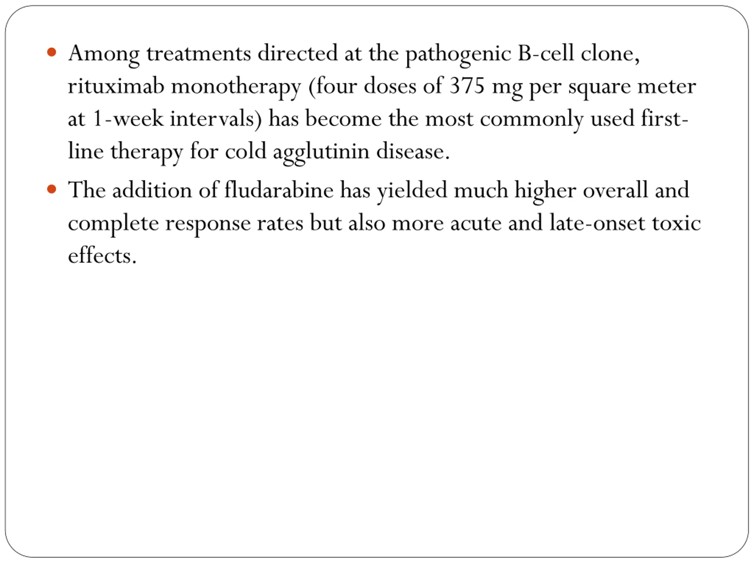 Among treatments directed at the pathogenic B-cell clone, rituximab monotherapy (four doses of 375 mg per square meter at 1-week intervals) has become the most commonly used first- line therapy for cold agglutinin disease. The addition of fludarabine has yielded much higher overall and complete response rates but also more acute and late-onset toxic effects.