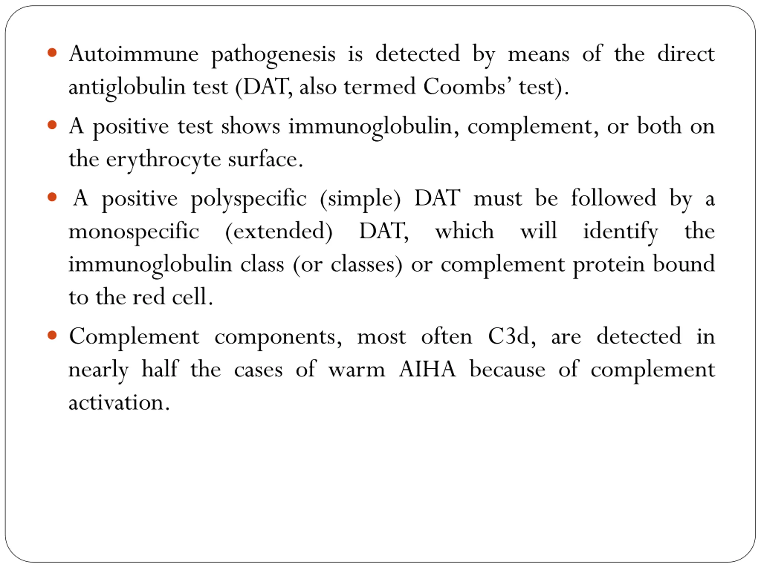 Autoimmune pathogenesis is detected by means of the direct antiglobulin test (DAT,also termed Coombs test). A positive test shows immunoglobulin, complement, or both on the erythrocyte surface. A positive polyspecific (simple) DAT must be followed by a monospecific (extended) DAT, which immunoglobulin class (or classes) or complement protein bound to the red cell. Complement components, most often C3d, are detected in nearly half the cases of warm AIHA because of complement activation. will identify the