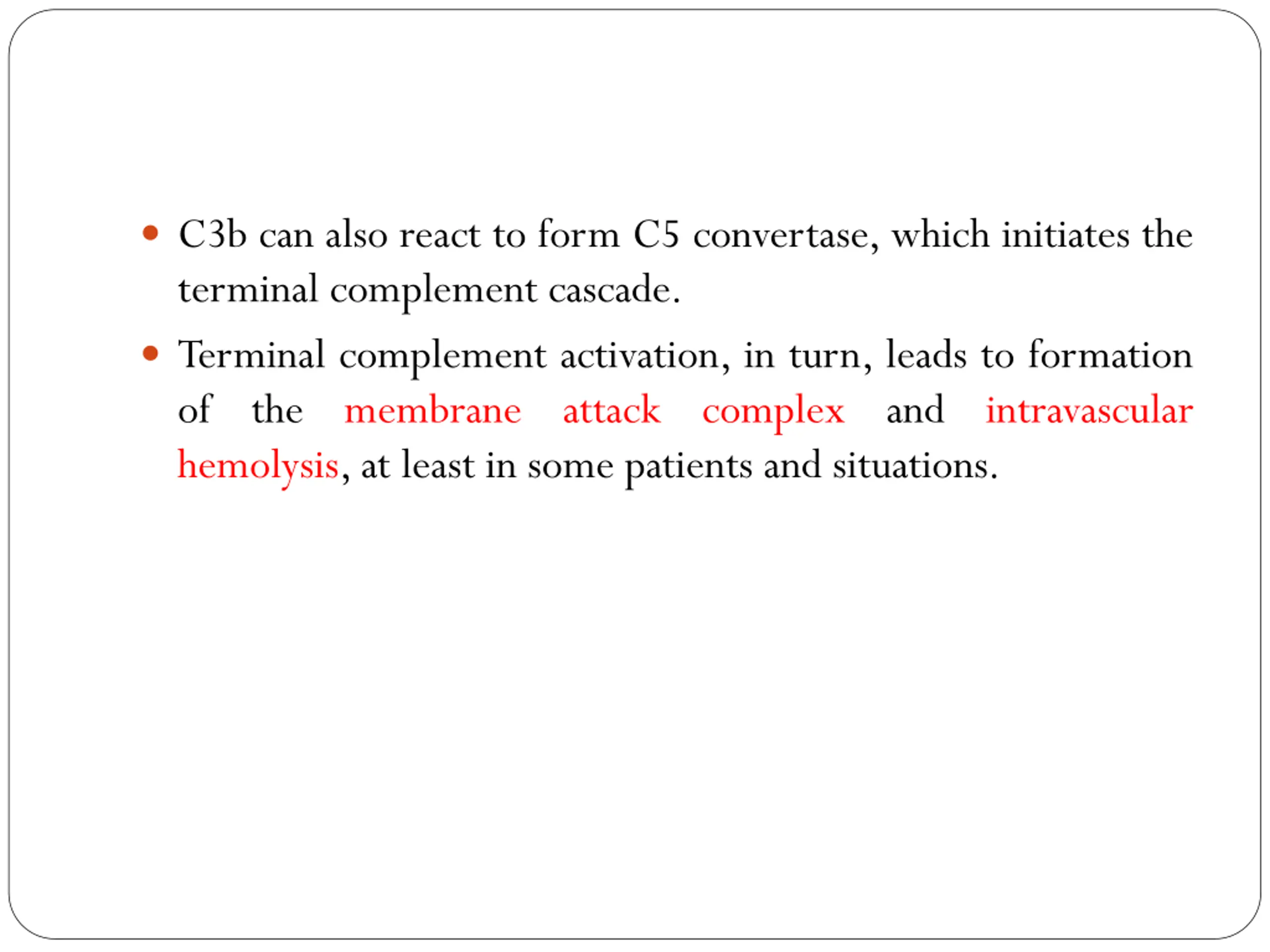 C3b can also react to form C5 convertase,which initiates the terminal complement cascade. Terminal complement activation, in turn, leads to formation of the membrane attack complex and intravascular hemolysis,at least in some patients and situations.