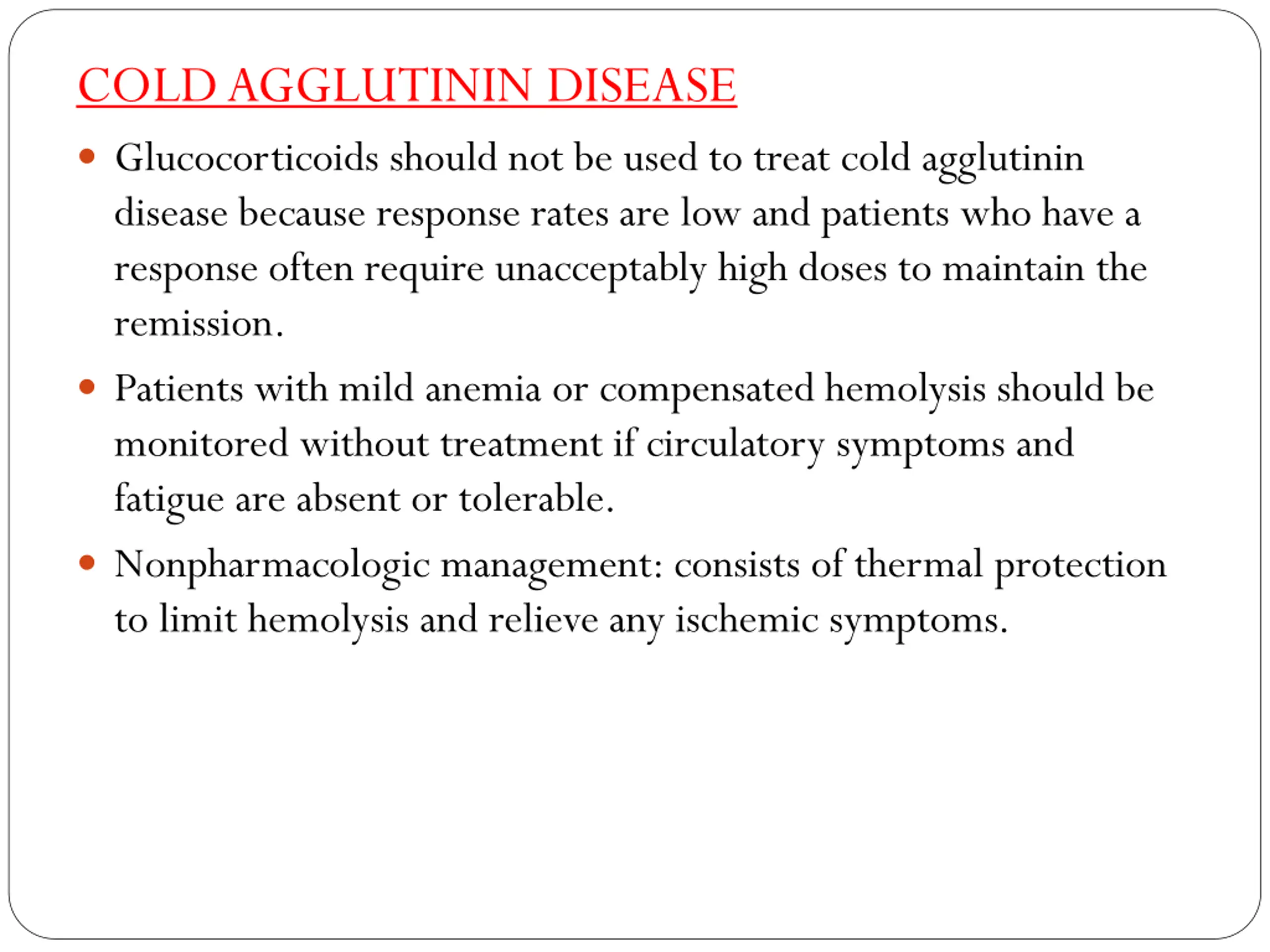 COLD AGGLUTININ DISEASE Glucocorticoids should not be used to treat cold agglutinin disease because response rates are low and patients who have a response often require unacceptably high doses to maintain the remission. Patients with mild anemia or compensated hemolysis should be monitored without treatment if circulatory symptoms and fatigue are absent or tolerable. Nonpharmacologic management: consists of thermal protection to limit hemolysis and relieve any ischemic symptoms.