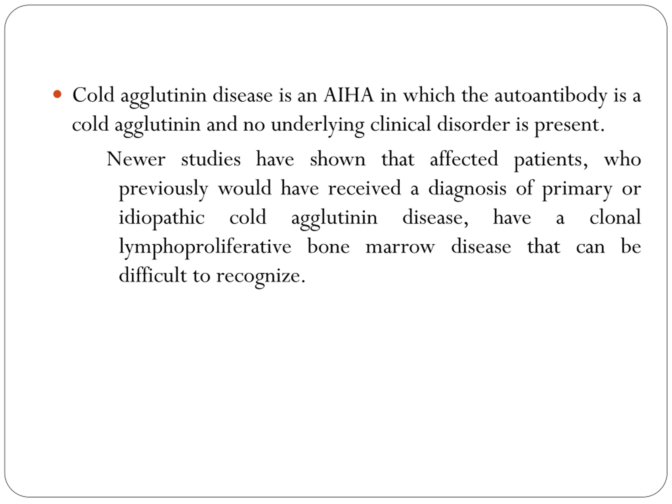 Cold agglutinin disease is an AIHA in which the autoantibody is a cold agglutinin and no underlying clinical disorder is present. Newer studies have shown that affected patients, who previously would have received a diagnosis of primary or idiopathic cold agglutinin lymphoproliferative bone marrow disease that can be difficult to recognize. disease, have a clonal