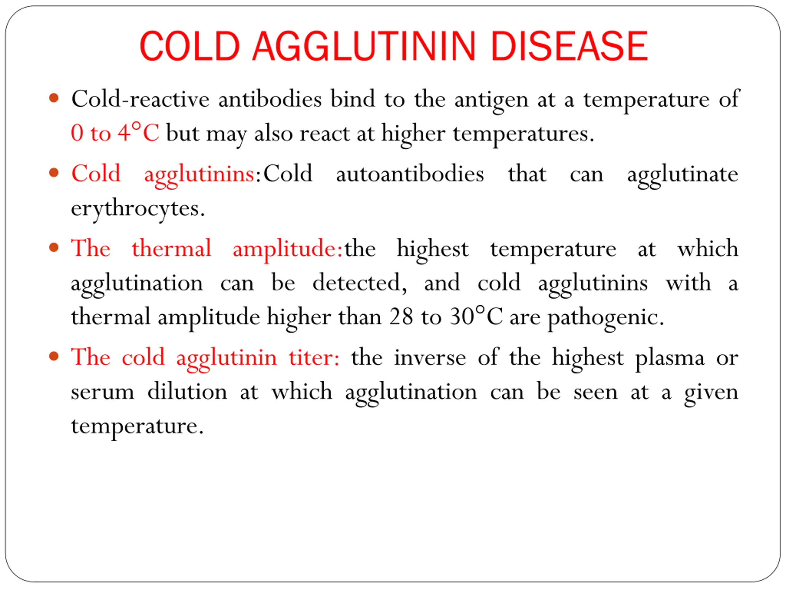 COLD AGGLUTININ DISEASE Cold-reactive antibodies bind to the antigen at a temperature of 0 to 4 C but may also react at higher temperatures. Cold agglutinins:Cold autoantibodies that can agglutinate erythrocytes. The thermal amplitude:the highest temperature at which agglutination can be detected, and cold agglutinins with a thermal amplitude higher than 28 to 30 C are pathogenic. The cold agglutinin titer: the inverse of the highest plasma or serum dilution at which agglutination can be seen at a given temperature.
