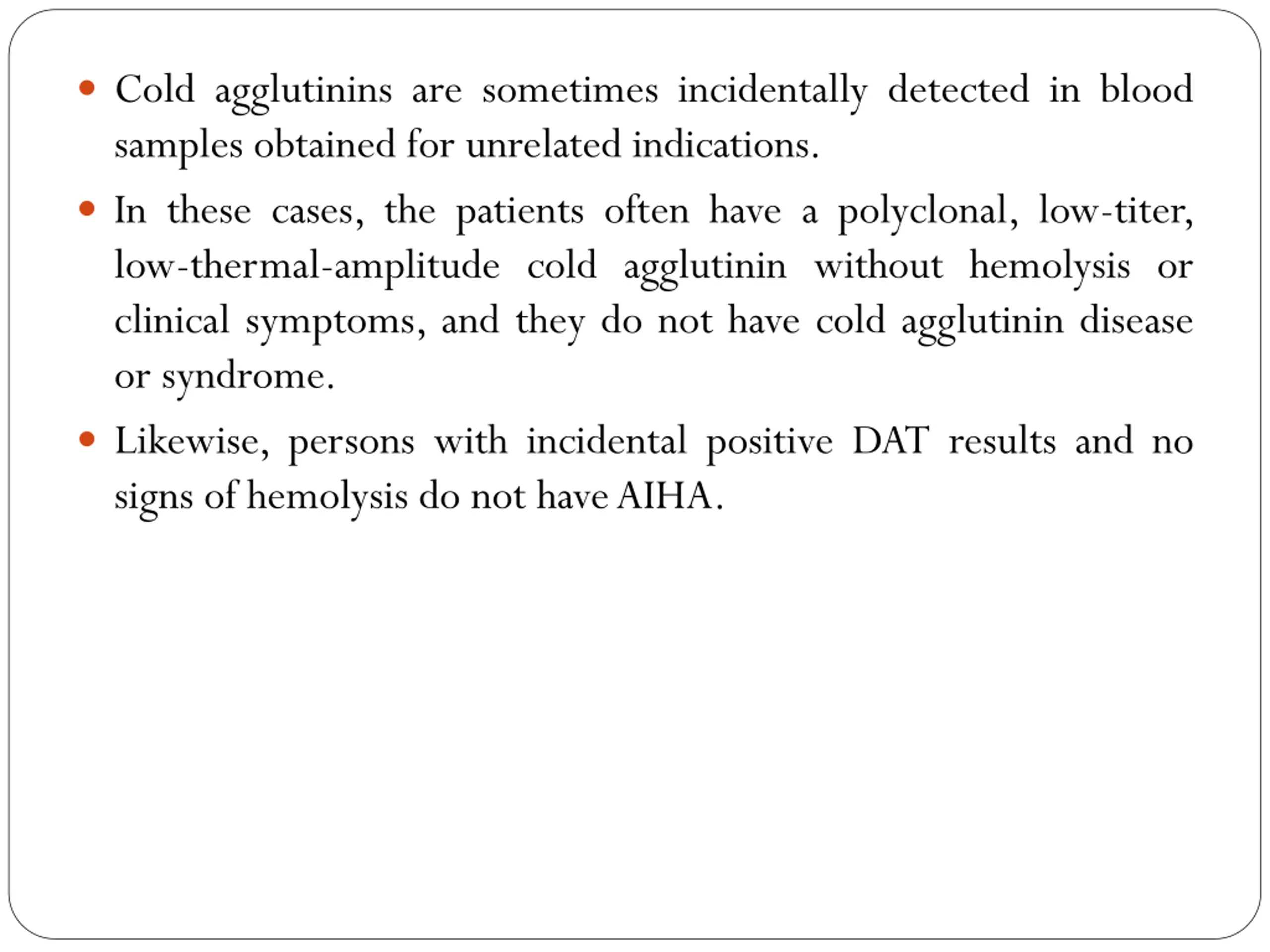 Cold agglutinins are sometimes incidentally detected in blood samples obtained for unrelated indications. In these cases, the patients often have a polyclonal, low-titer, low-thermal-amplitude cold agglutinin without hemolysis or clinical symptoms, and they do not have cold agglutinin disease or syndrome. Likewise, persons with incidental positive DAT results and no signs of hemolysis do not haveAIHA.