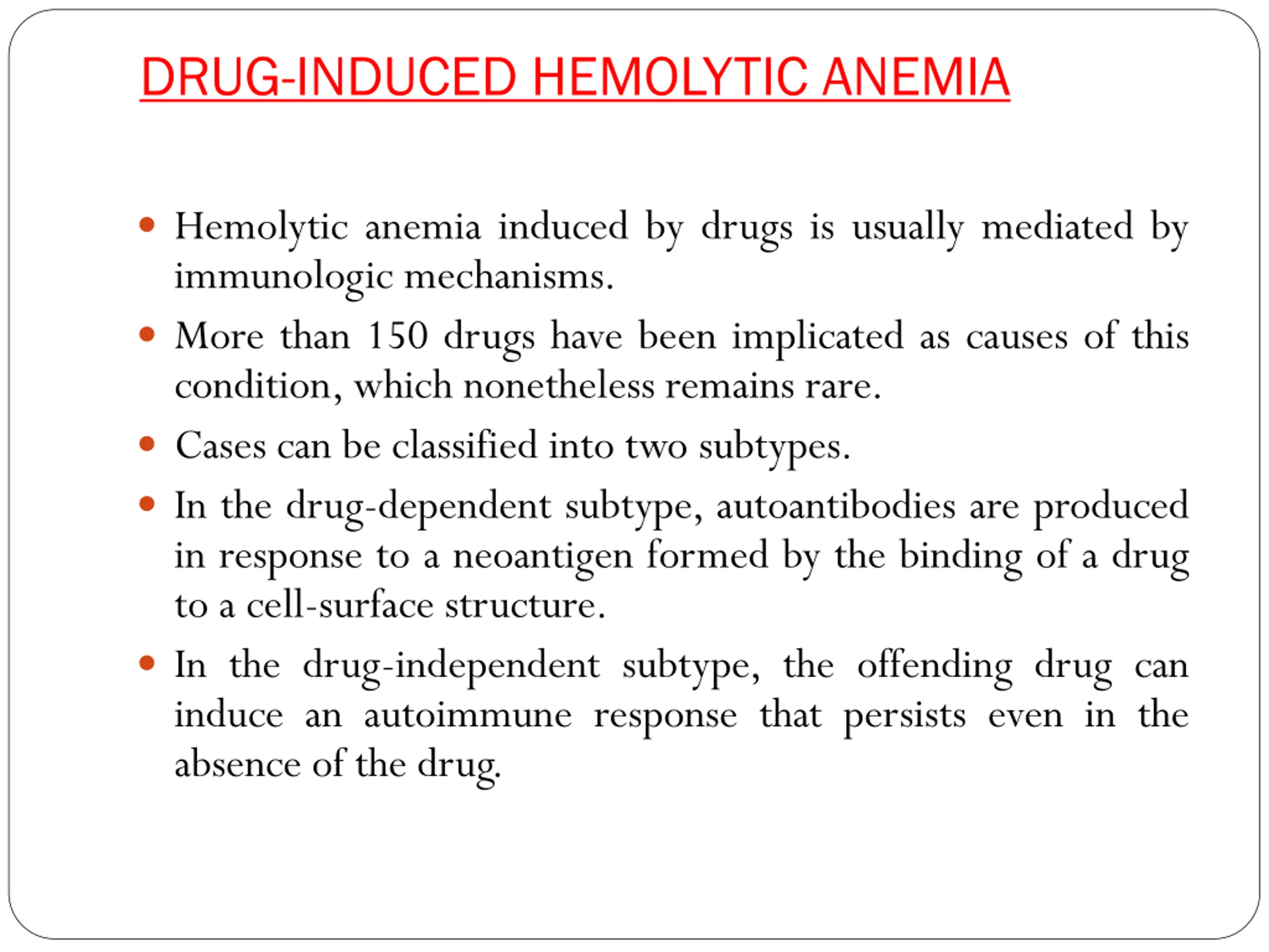 DRUG-INDUCED HEMOLYTIC ANEMIA Hemolytic anemia induced by drugs is usually mediated by immunologic mechanisms. More than 150 drugs have been implicated as causes of this condition,which nonetheless remains rare. Cases can be classified into two subtypes. In the drug-dependent subtype, autoantibodies are produced in response to a neoantigen formed by the binding of a drug to a cell-surface structure. In the drug-independent subtype, the offending drug can induce an autoimmune response that persists even in the absence of the drug.