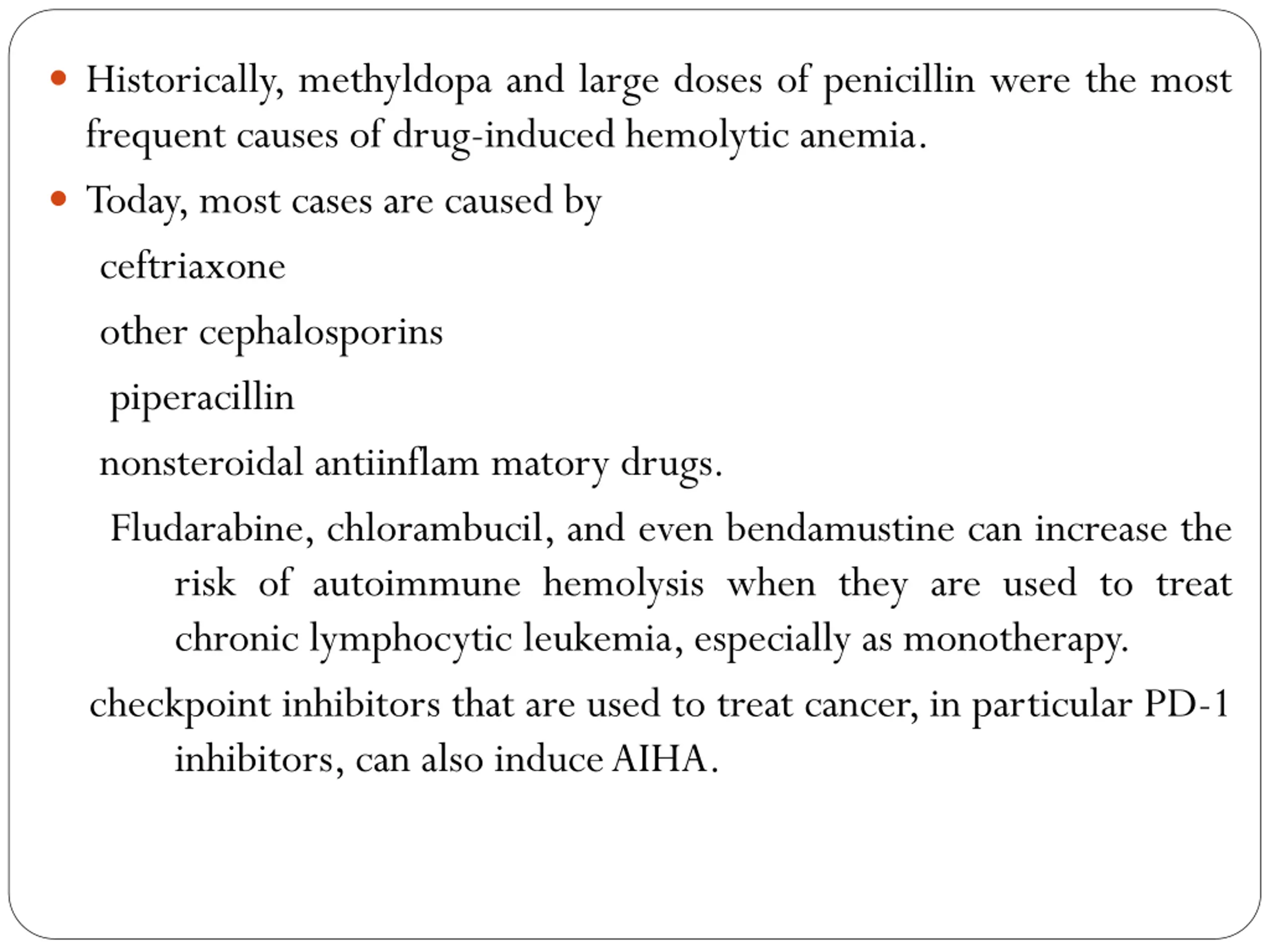 Historically, methyldopa and large doses of penicillin were the most frequent causes of drug-induced hemolytic anemia. Today,most cases are caused by ceftriaxone other cephalosporins piperacillin nonsteroidal antiinflam matory drugs. Fludarabine, chlorambucil, and even bendamustine can increase the risk of autoimmune hemolysis when they are used to treat chronic lymphocytic leukemia,especially as monotherapy. checkpoint inhibitors that are used to treat cancer,in particular PD-1 inhibitors,can also induceAIHA.
