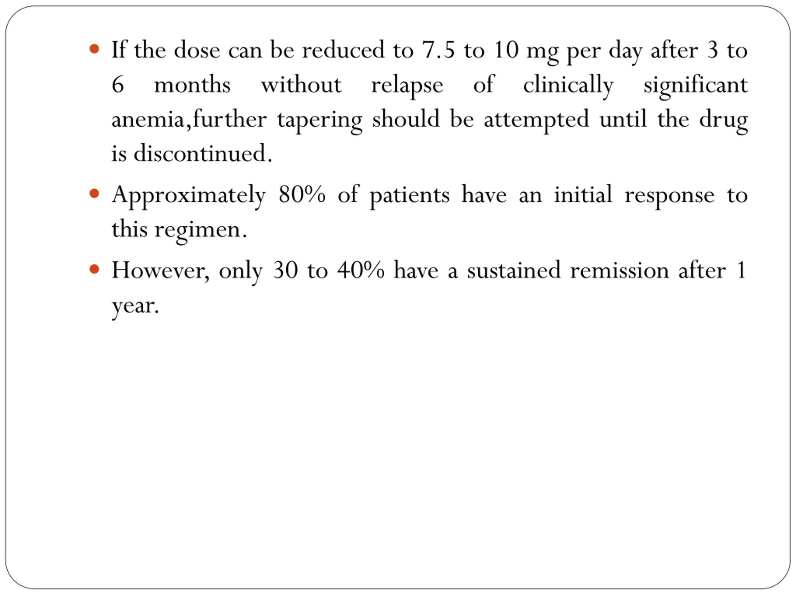 If the dose can be reduced to 7.5 to 10 mg per day after 3 to 6 months without relapse anemia,further tapering should be attempted until the drug is discontinued. Approximately 80% of patients have an initial response to this regimen. However, only 30 to 40% have a sustained remission after 1 year. of clinically significant