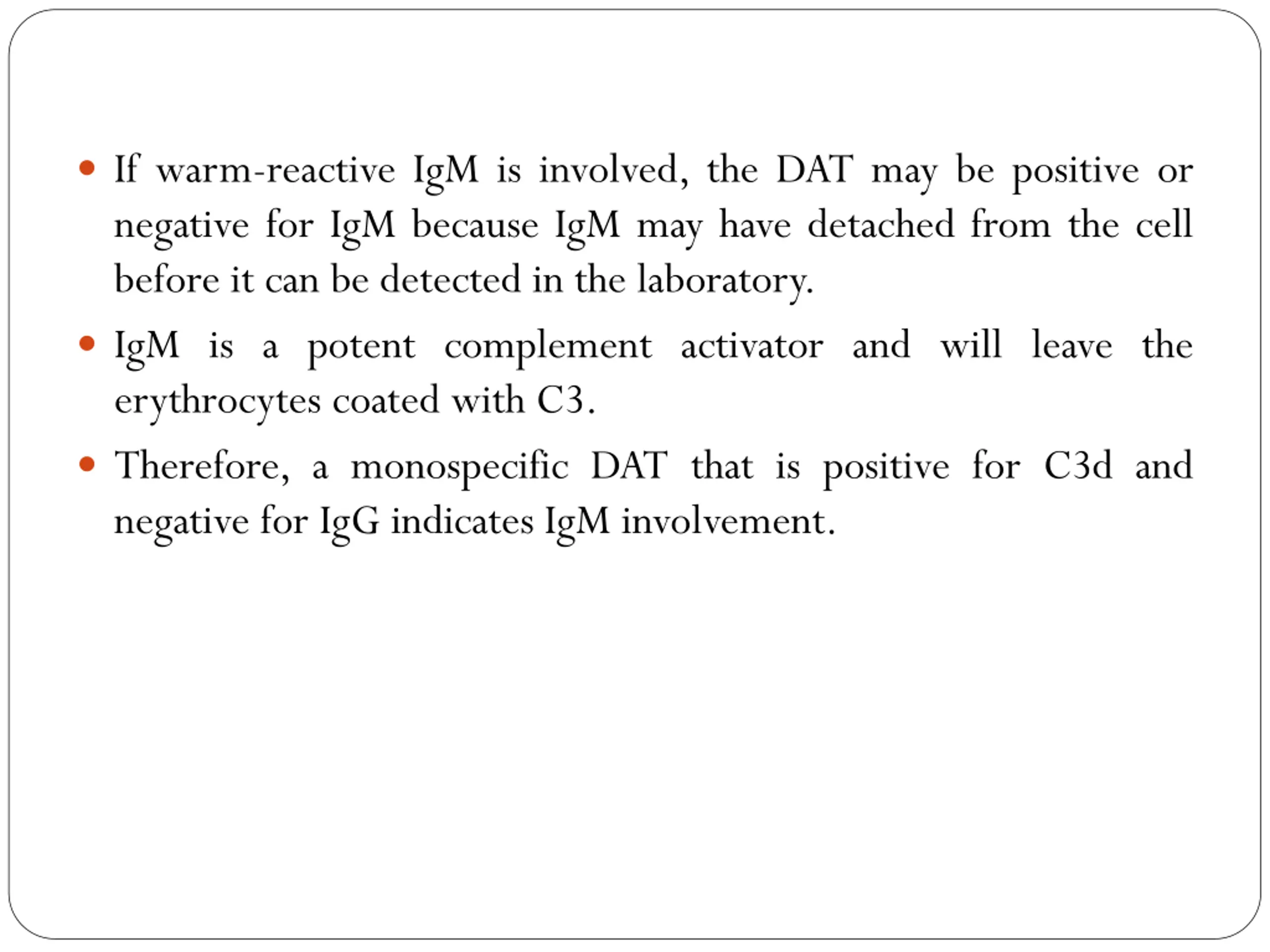 If warm-reactive IgM is involved, the DAT may be positive or negative for IgM because IgM may have detached from the cell before it can be detected in the laboratory. IgM is a potent complement activator and will leave the erythrocytes coated with C3. Therefore, a monospecific DAT that is positive for C3d and negative for IgG indicates IgM involvement.