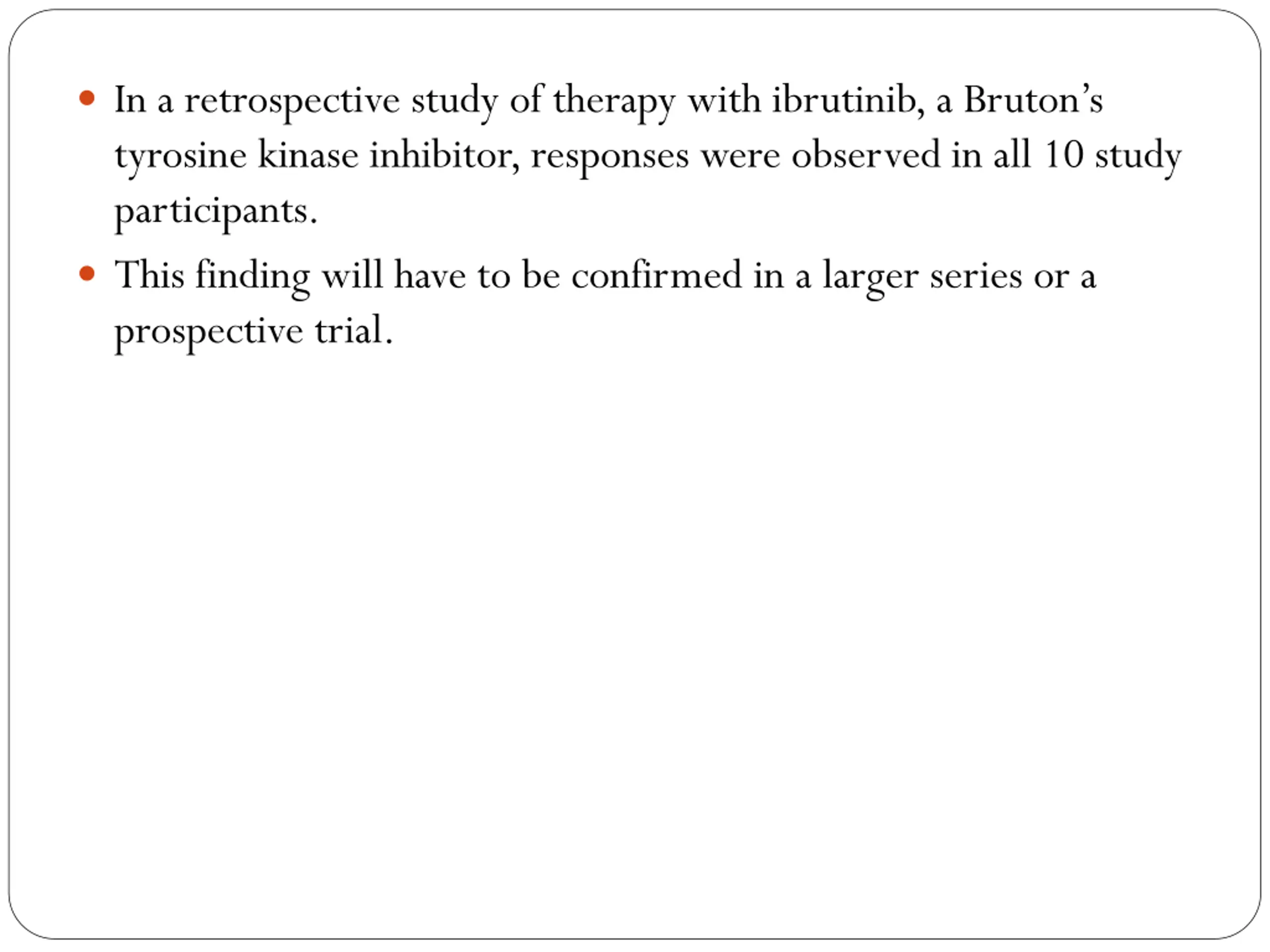In a retrospective study of therapy with ibrutinib, a Brutons tyrosine kinase inhibitor, responses were observed in all 10 study participants. This finding will have to be confirmed in a larger series or a prospective trial.