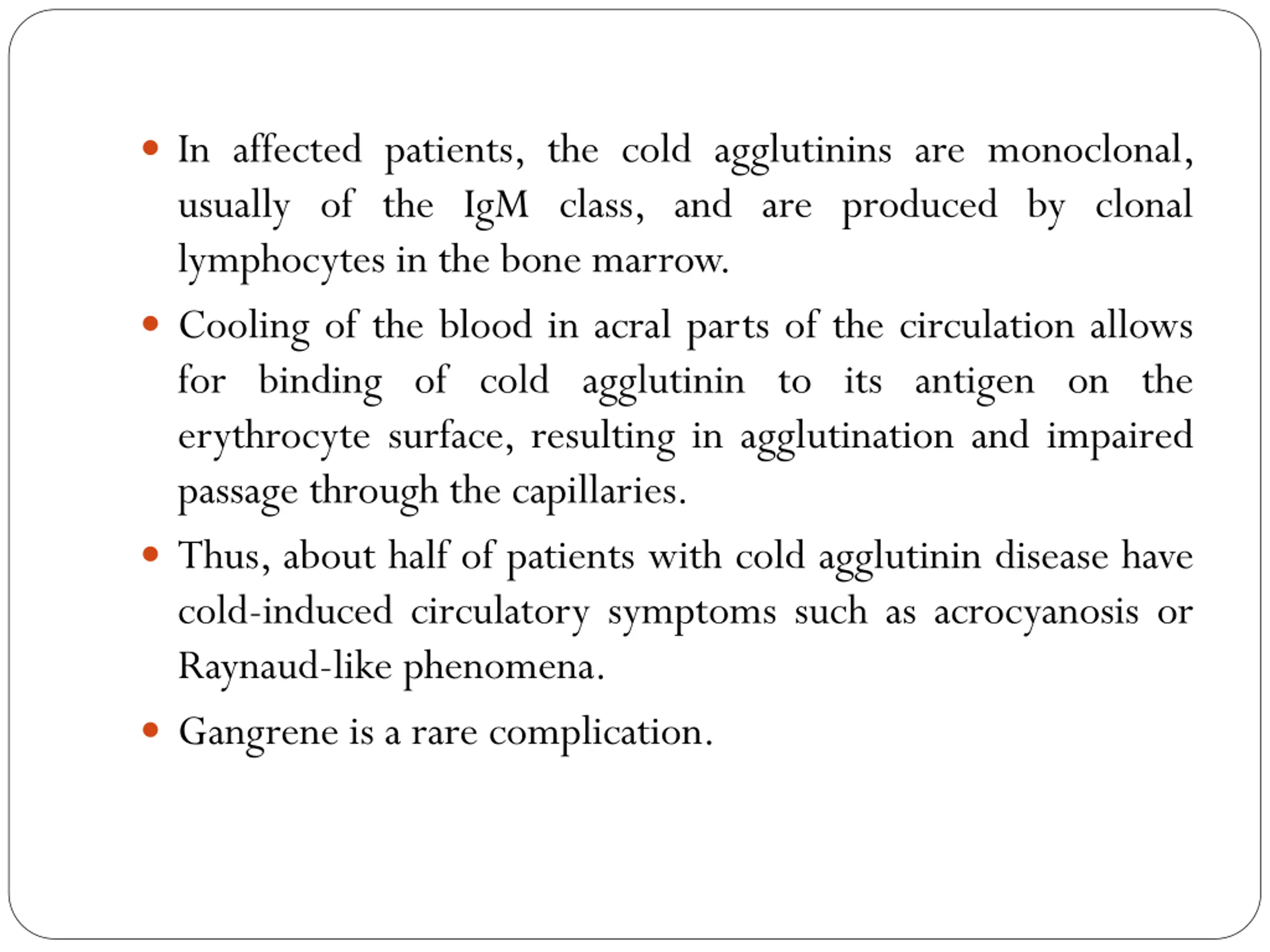In affected patients, the cold agglutinins are monoclonal, usually of the IgM class, and are produced by clonal lymphocytes in the bone marrow. Cooling of the blood in acral parts of the circulation allows for binding of cold agglutinin to its antigen on the erythrocyte surface, resulting in agglutination and impaired passage through the capillaries. Thus, about half of patients with cold agglutinin disease have cold-induced circulatory symptoms such as acrocyanosis or Raynaud-like phenomena. Gangrene is a rare complication.