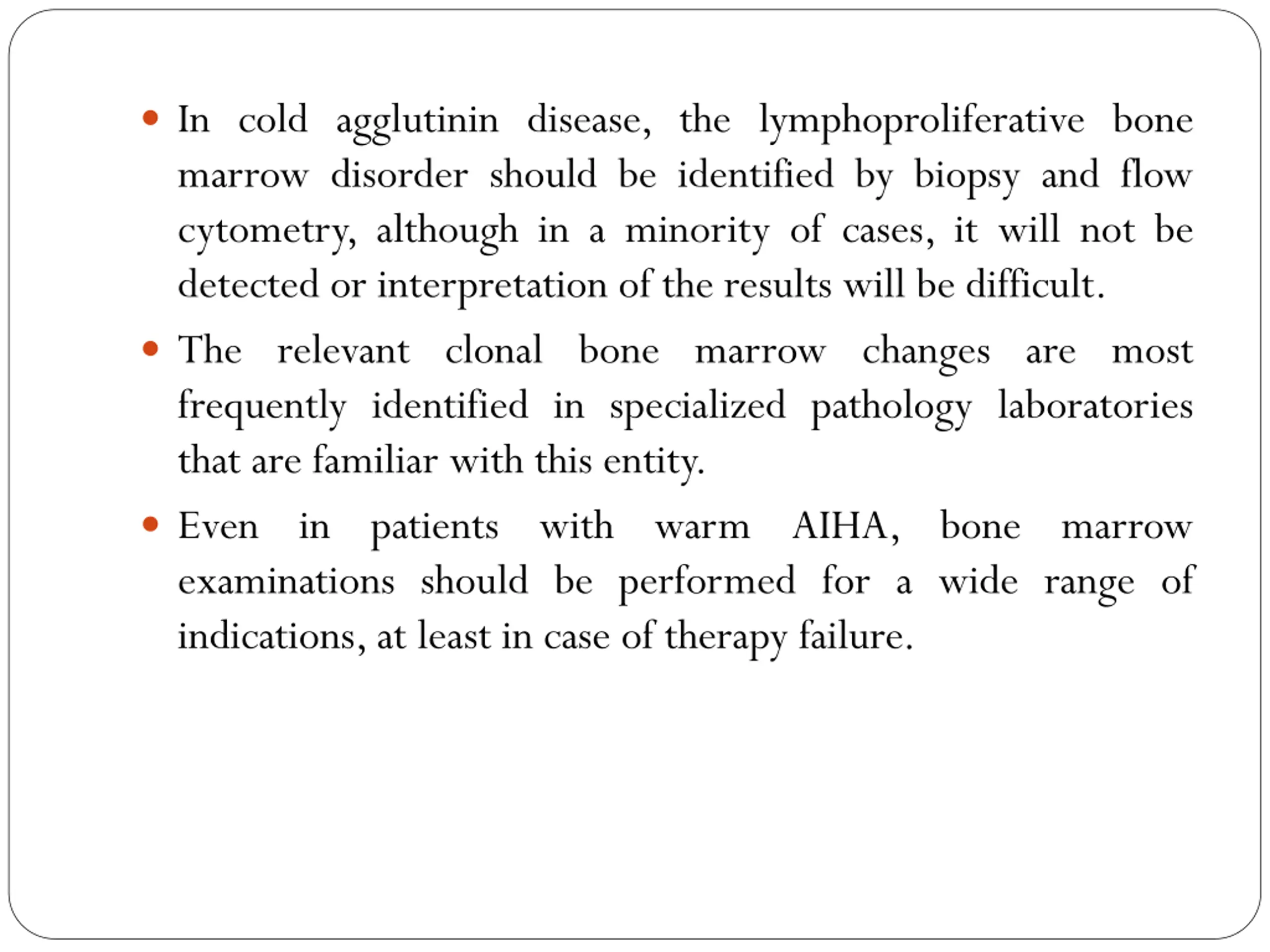In cold agglutinin disease, the lymphoproliferative bone marrow disorder should be identified by biopsy and flow cytometry, although in a minority of cases, it will not be detected or interpretation of the results will be difficult. The relevant clonal bone marrow changes are most frequently identified in specialized pathology laboratories that are familiar with this entity. Even in patients with warm AIHA, bone marrow examinations should be performed for a wide range of indications,at least in case of therapy failure.