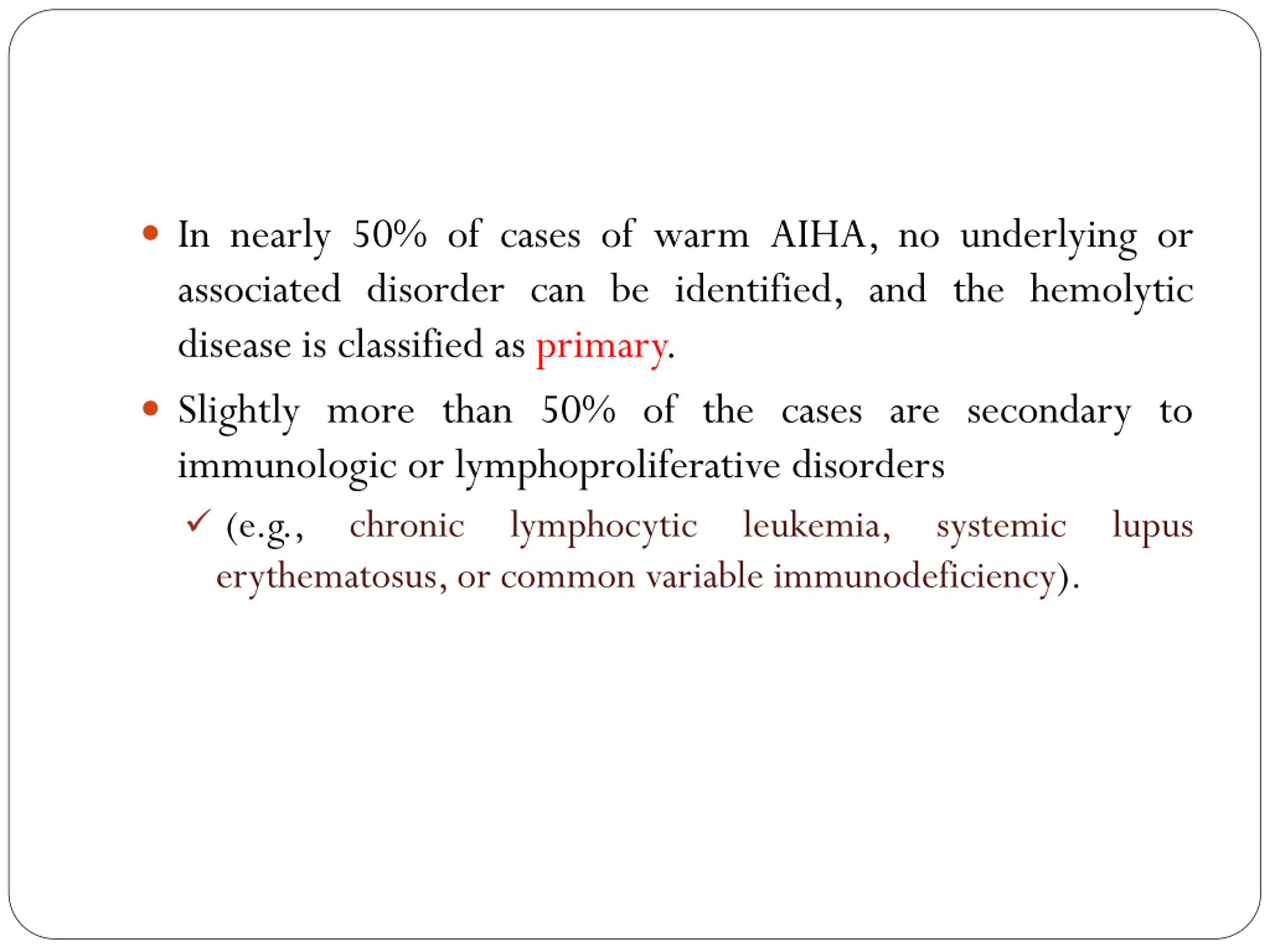 In nearly 50% of cases of warm AIHA, no underlying or associated disorder can be identified, and the hemolytic disease is classified as primary. Slightly more than 50% of the cases are secondary to immunologic or lymphoproliferative disorders (e.g., chronic lymphocytic erythematosus,or common variable immunodeficiency). leukemia, systemic lupus