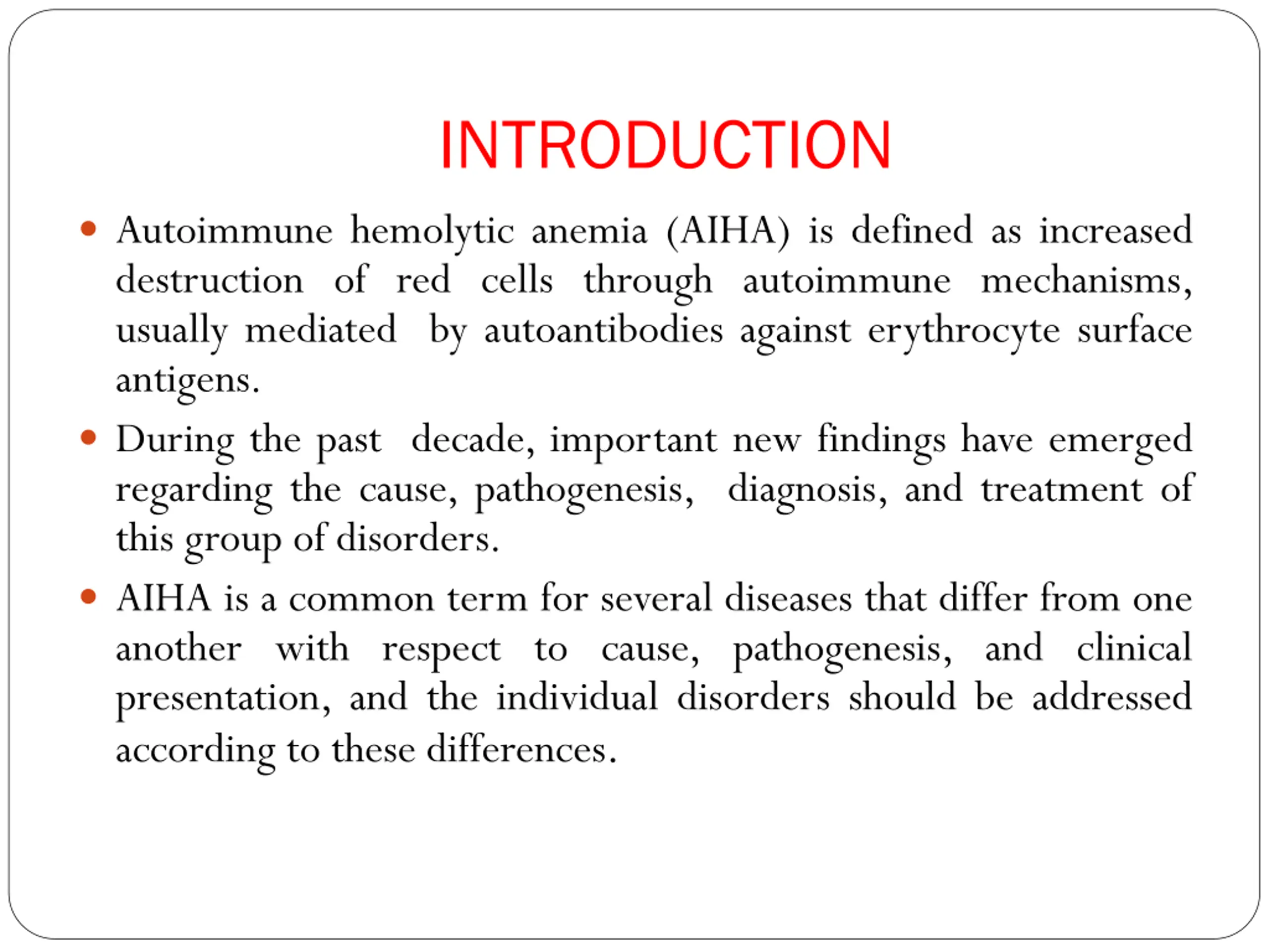 INTRODUCTION Autoimmune hemolytic anemia (AIHA) is defined as increased destruction of red cells through autoimmune mechanisms, usually mediated by autoantibodies against erythrocyte surface antigens. During the past decade, important new findings have emerged regarding the cause, pathogenesis, diagnosis, and treatment of this group of disorders. AIHA is a common term for several diseases that differ from one another with respect to cause, pathogenesis, and clinical presentation, and the individual disorders should be addressed according to these differences.