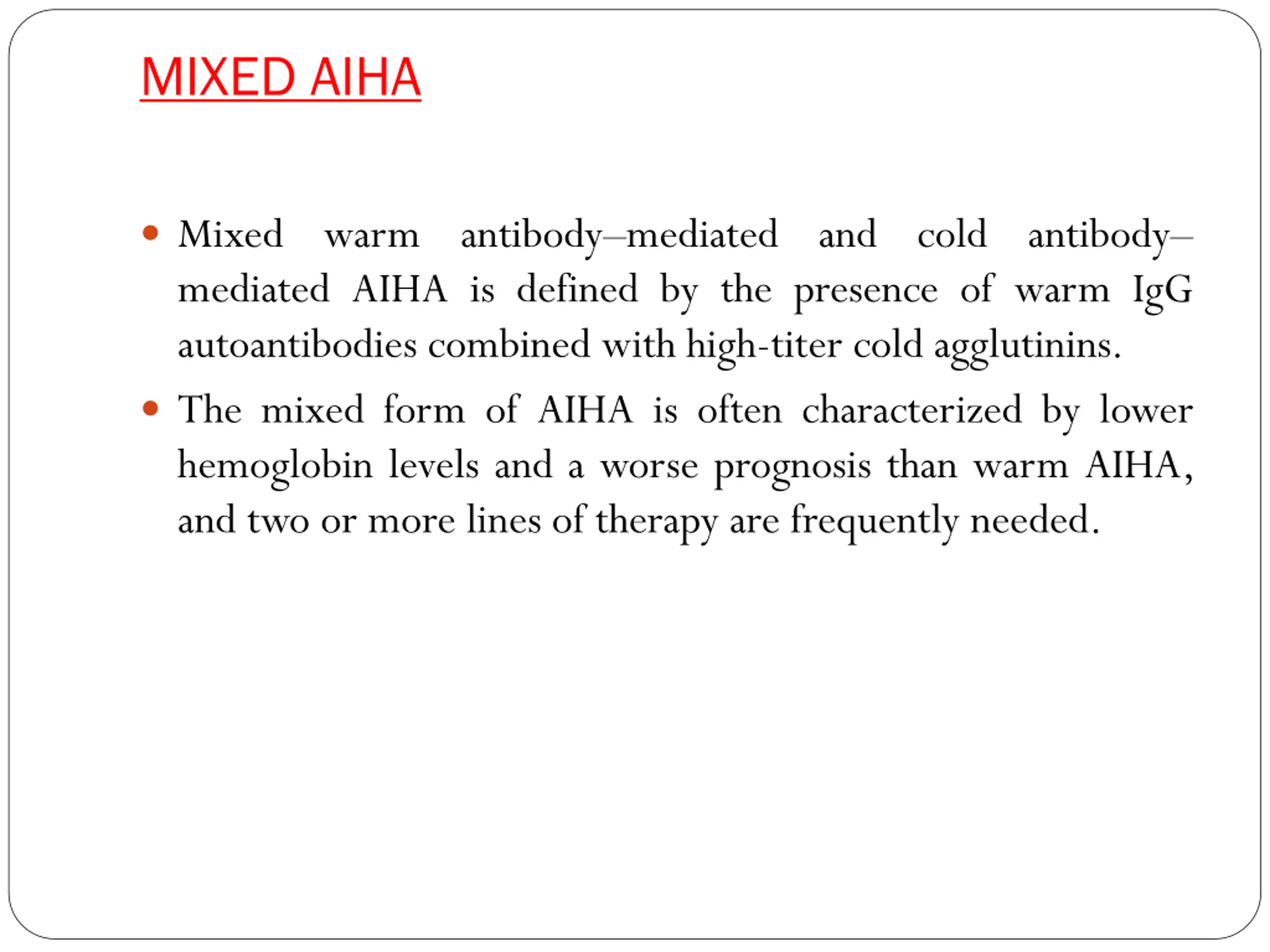 MIXED AIHA Mixed warm antibody mediated and cold antibody mediated AIHA is defined by the presence of warm IgG autoantibodies combined with high-titer cold agglutinins. The mixed form of AIHA is often characterized by lower hemoglobin levels and a worse prognosis than warm AIHA, and two or more lines of therapy are frequently needed.