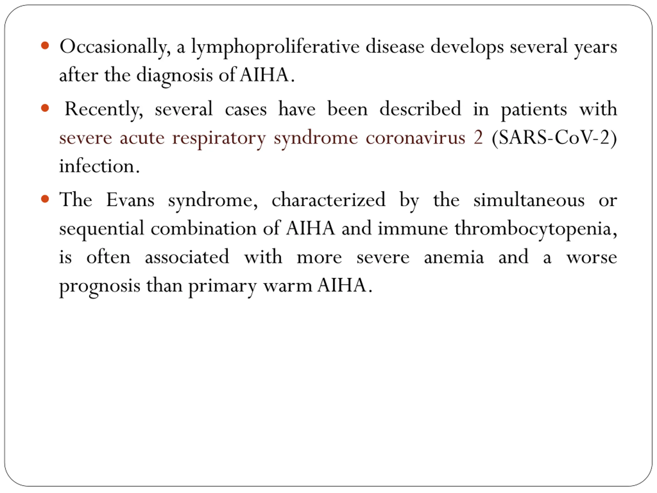 Occasionally,a lymphoproliferative disease develops several years after the diagnosis ofAIHA. Recently, several cases have been described in patients with severe acute respiratory syndrome coronavirus 2 (SARS-CoV-2) infection. The Evans syndrome, characterized by the simultaneous or sequential combination of AIHA and immune thrombocytopenia, is often associated with more severe anemia and a worse prognosis than primary warmAIHA.