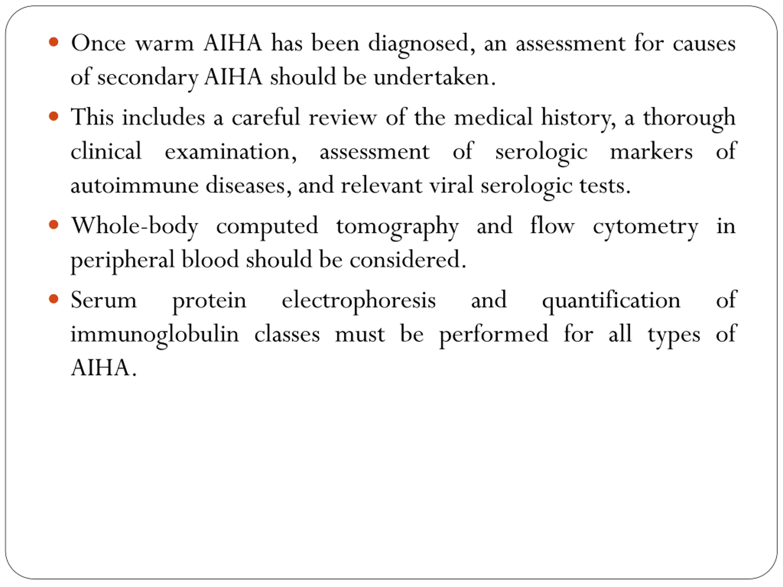 Once warm AIHA has been diagnosed, an assessment for causes of secondaryAIHA should be undertaken. This includes a careful review of the medical history, a thorough clinical examination, assessment of serologic markers of autoimmune diseases,and relevant viral serologic tests. Whole-body computed tomography and flow cytometry in peripheral blood should be considered. Serum protein electrophoresis immunoglobulin classes must be performed for all types of AIHA. and quantification of