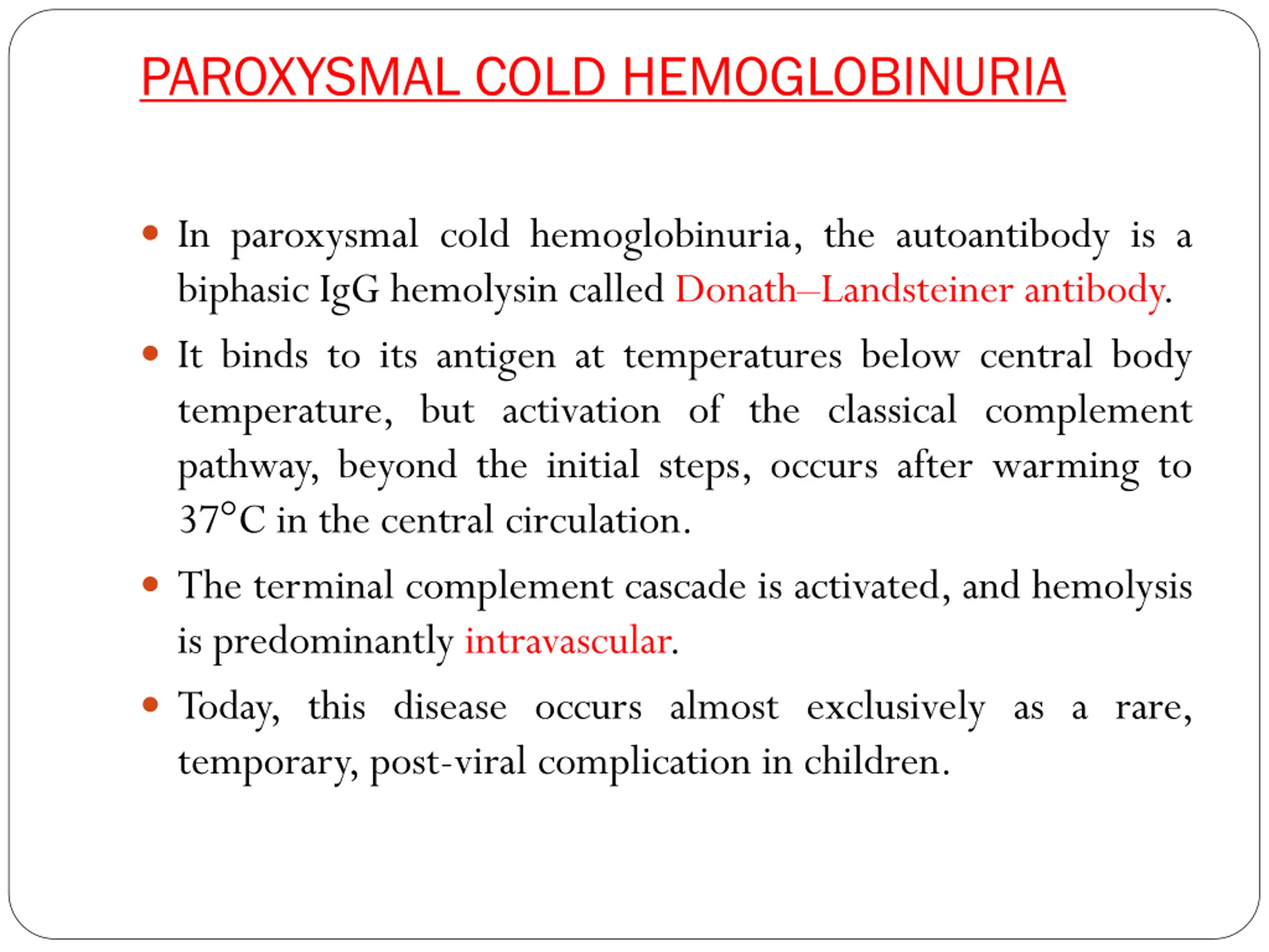 PAROXYSMAL COLD HEMOGLOBINURIA In paroxysmal cold hemoglobinuria, the autoantibody is a biphasic IgG hemolysin called Donath Landsteiner antibody. It binds to its antigen at temperatures below central body temperature, but activation of the classical complement pathway, beyond the initial steps, occurs after warming to 37 C in the central circulation. The terminal complement cascade is activated,and hemolysis is predominantly intravascular. Today, this disease occurs almost exclusively as a rare, temporary,post-viral complication in children.