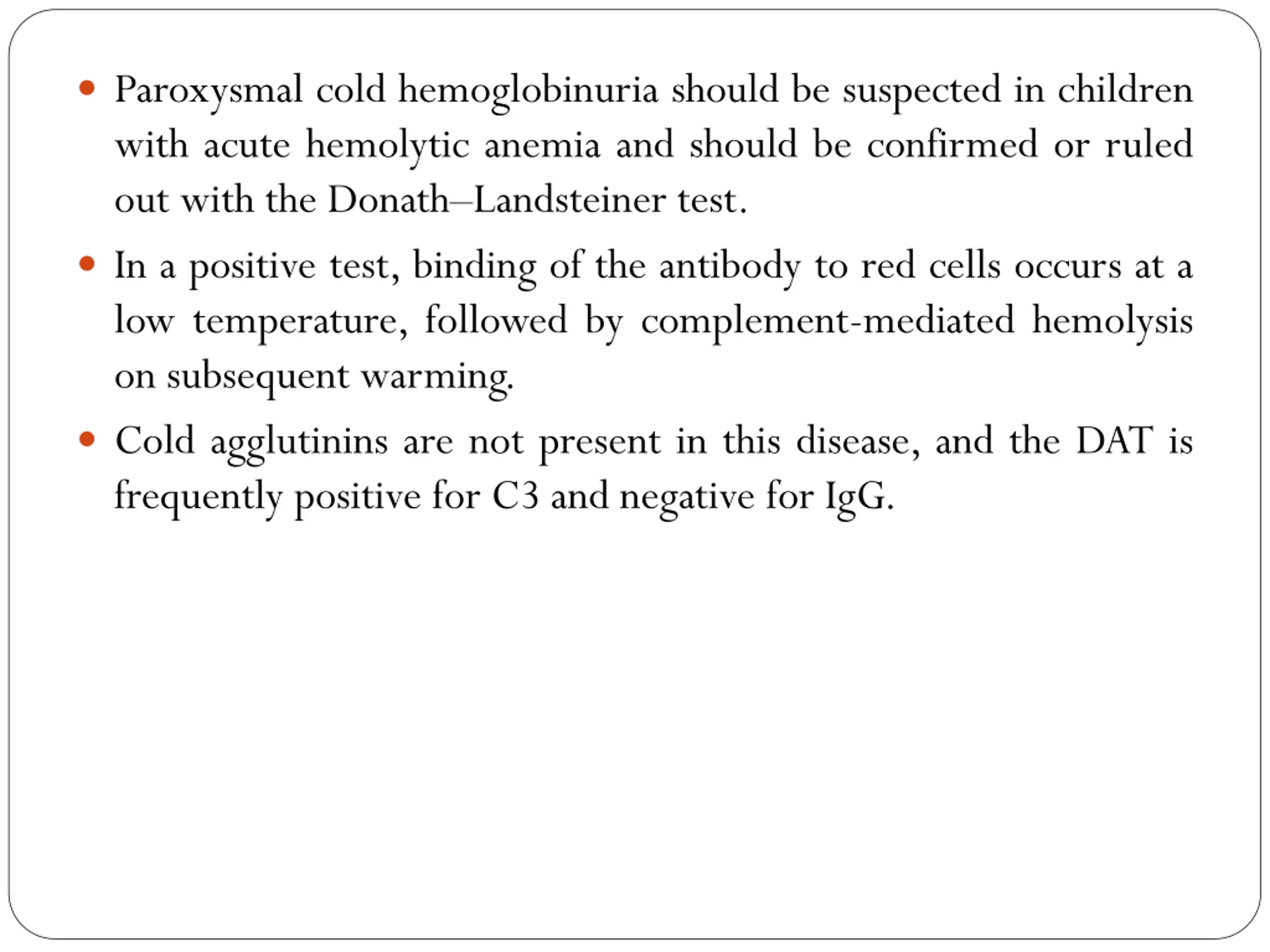 Paroxysmal cold hemoglobinuria should be suspected in children with acute hemolytic anemia and should be confirmed or ruled out with the Donath Landsteiner test. In a positive test, binding of the antibody to red cells occurs at a low temperature, followed by complement-mediated hemolysis on subsequent warming. Cold agglutinins are not present in this disease, and the DAT is frequently positive for C3 and negative for IgG.
