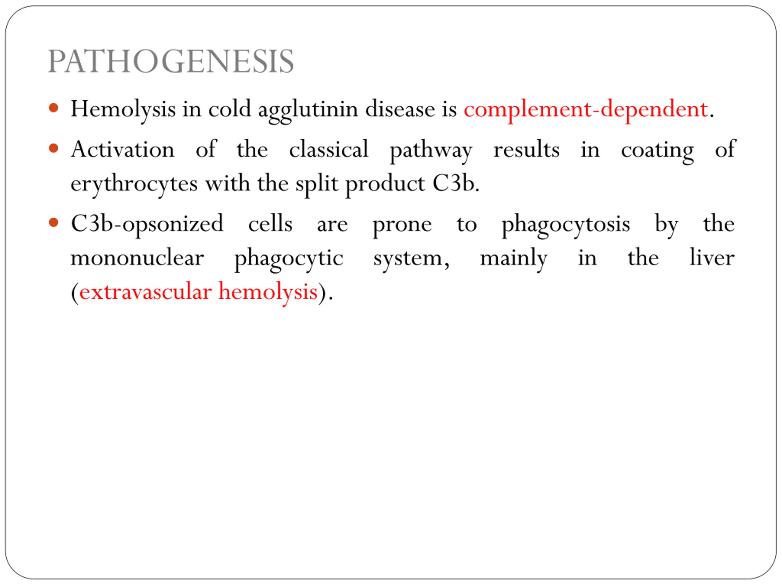 PATHOGENESIS Hemolysis in cold agglutinin disease is complement-dependent. Activation of the classical pathway results in coating of erythrocytes with the split product C3b. C3b-opsonized cells are prone to phagocytosis by the mononuclear phagocytic system, (extravascular hemolysis). mainly in the liver