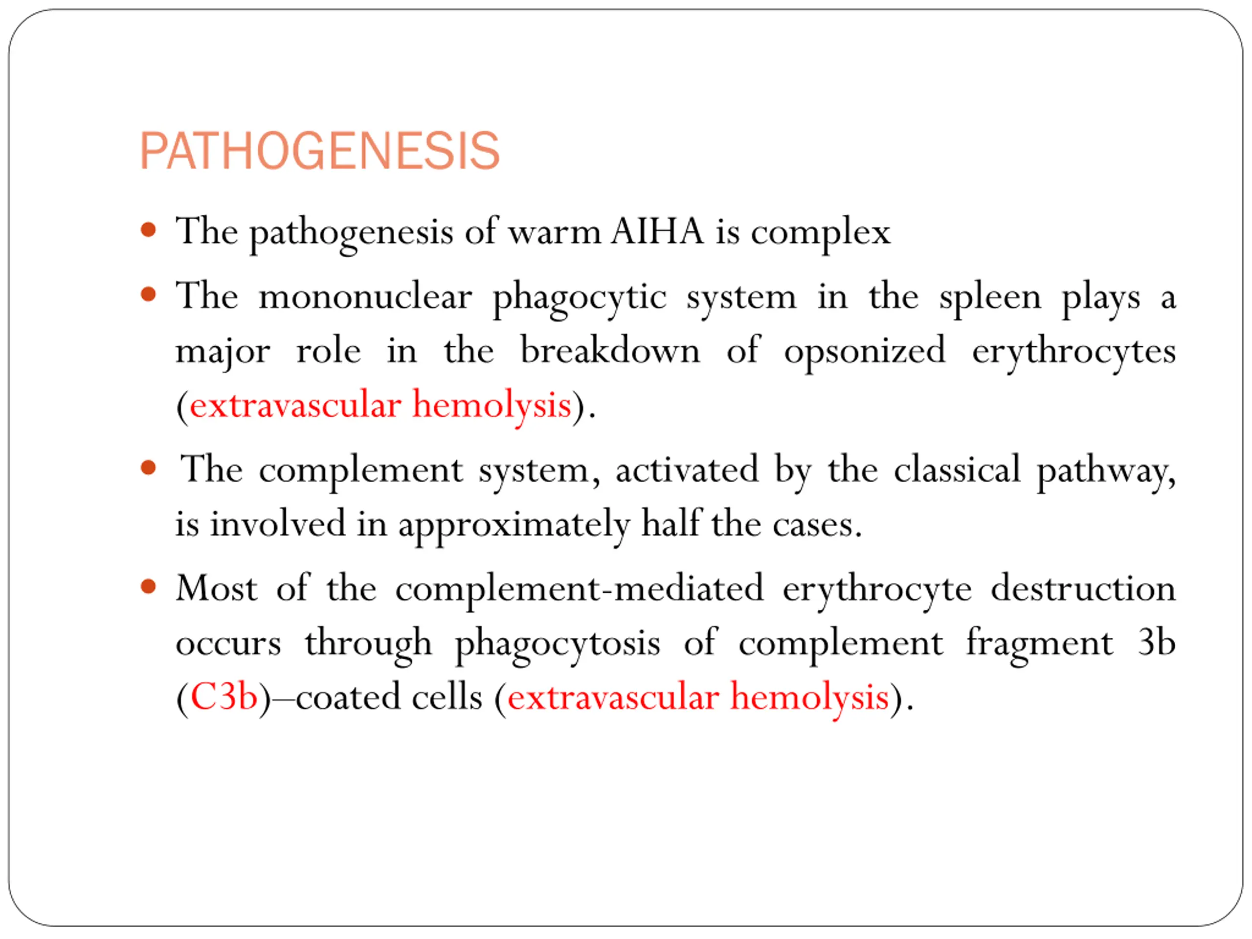 PATHOGENESIS The pathogenesis of warmAIHA is complex The mononuclear phagocytic system in the spleen plays a major role in the breakdown of opsonized erythrocytes (extravascular hemolysis). The complement system, activated by the classical pathway, is involved in approximately half the cases. Most of the complement-mediated erythrocyte destruction occurs through phagocytosis of complement fragment 3b (C3b) coated cells (extravascular hemolysis).