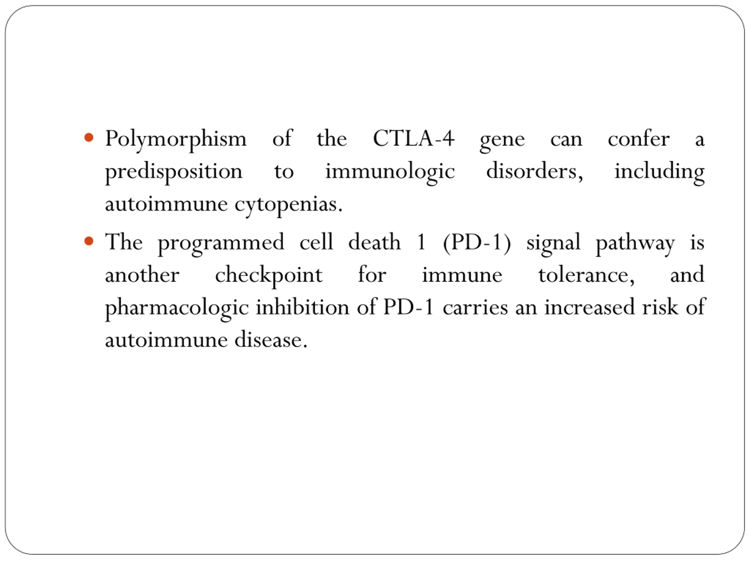 Polymorphism predisposition autoimmune cytopenias. The programmed cell death 1 (PD-1) signal pathway is another checkpoint for pharmacologic inhibition of PD-1 carries an increased risk of autoimmune disease. of to the immunologic CTLA-4 gene disorders, can confer including a immune tolerance, and