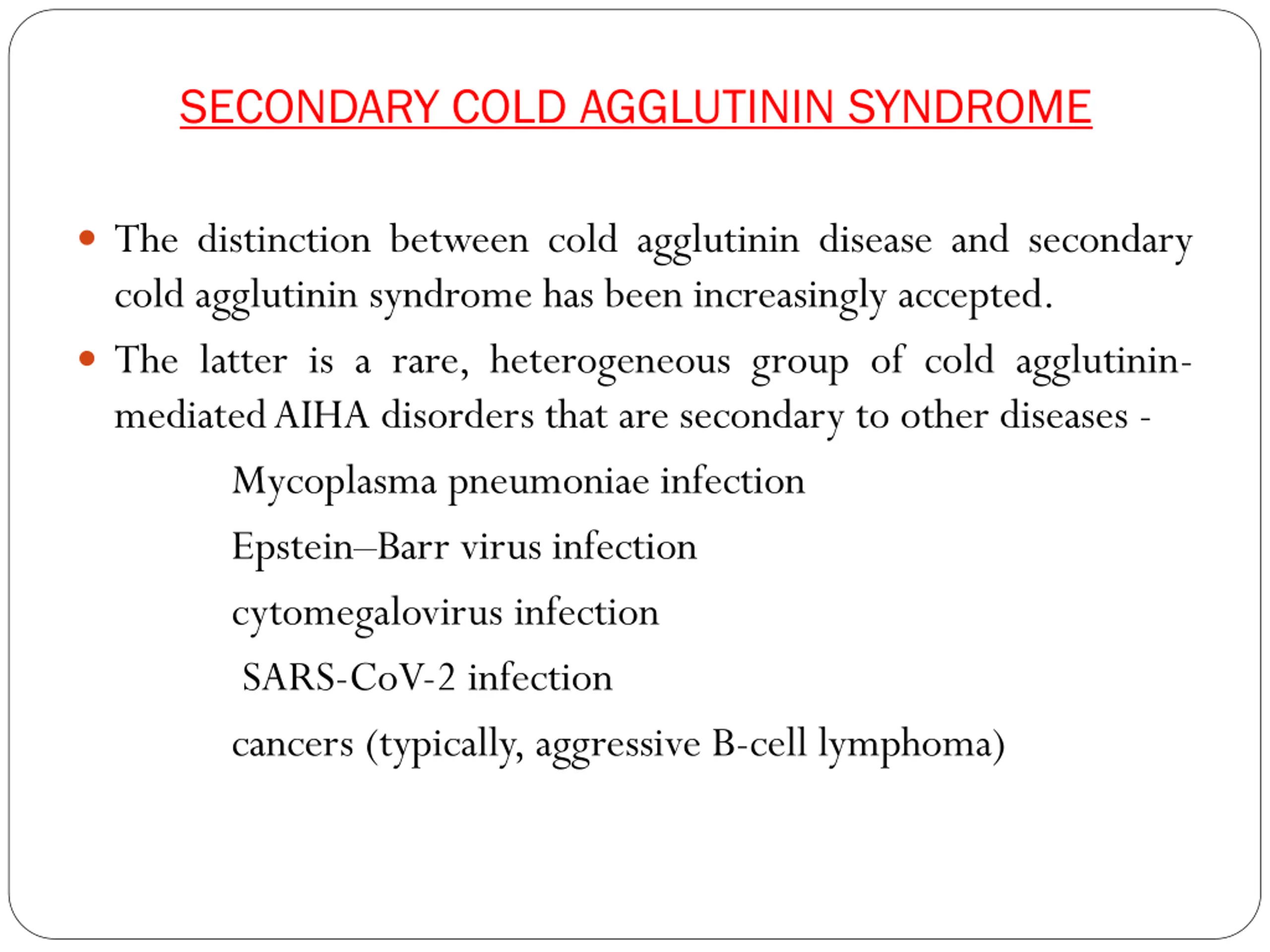 SECONDARY COLD AGGLUTININ SYNDROME The distinction between cold agglutinin disease and secondary cold agglutinin syndrome has been increasingly accepted. The latter is a rare, heterogeneous group of cold agglutinin- mediatedAIHA disorders that are secondary to other diseases - Mycoplasma pneumoniae infection Epstein Barr virus infection cytomegalovirus infection SARS-CoV-2 infection cancers (typically,aggressive B-cell lymphoma)