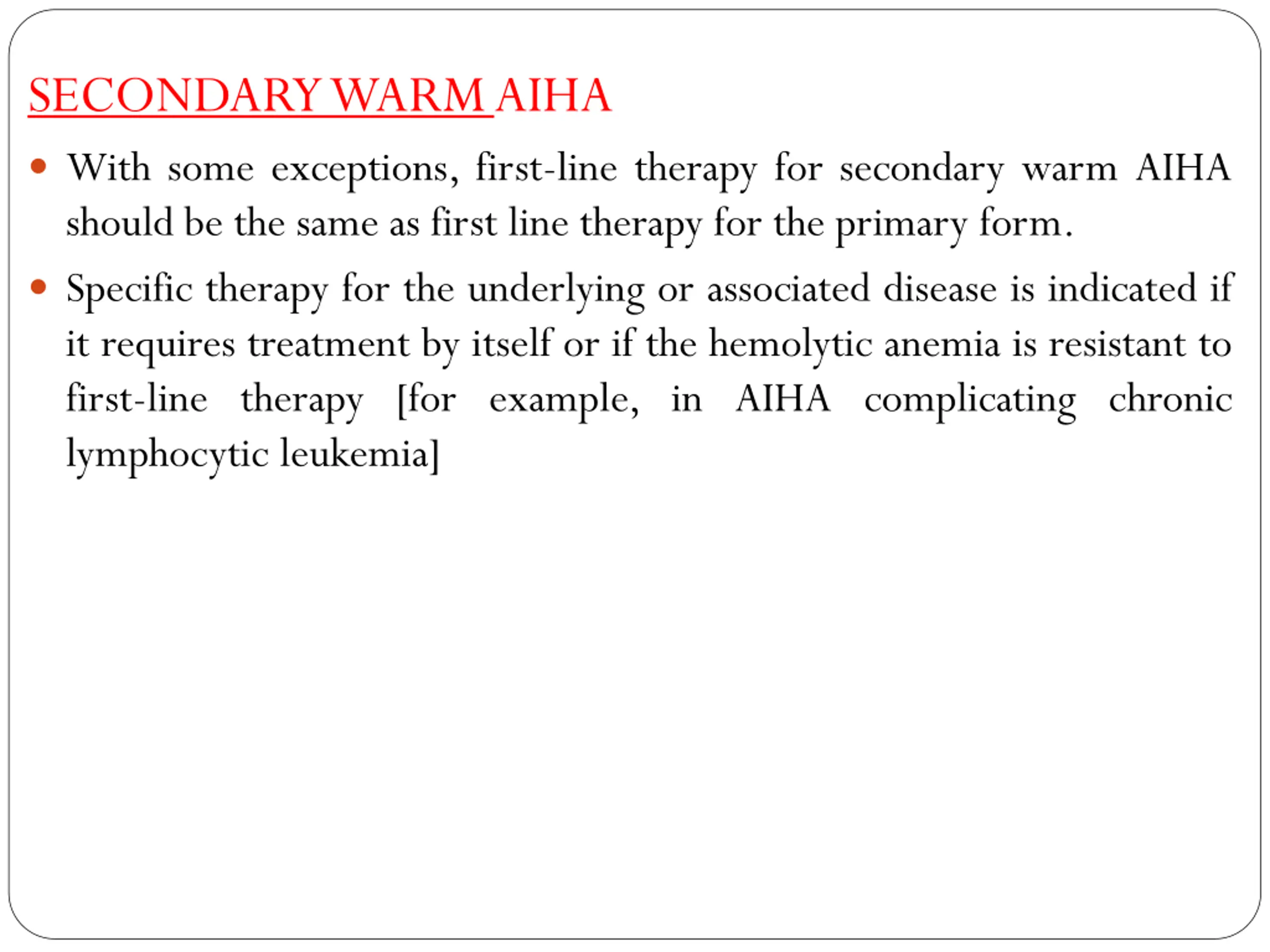 SECONDARYWARMAIHA With some exceptions, first-line therapy for secondary warm AIHA should be the same as first line therapy for the primary form. Specific therapy for the underlying or associated disease is indicated if it requires treatment by itself or if the hemolytic anemia is resistant to first-line therapy [for example, in AIHA complicating chronic lymphocytic leukemia]