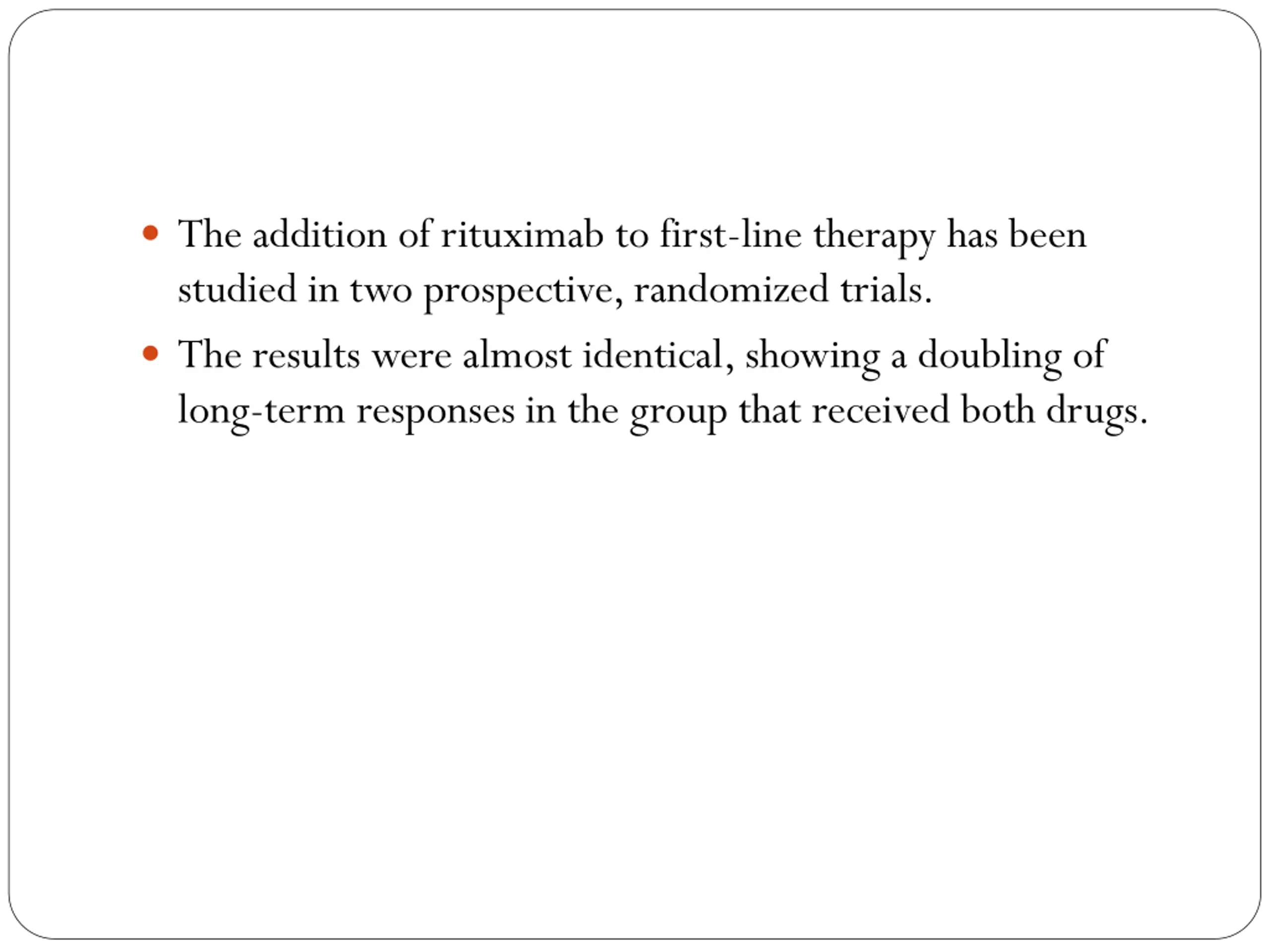 The addition of rituximab to first-line therapy has been studied in two prospective, randomized trials. The results were almost identical, showing a doubling of long-term responses in the group that received both drugs.