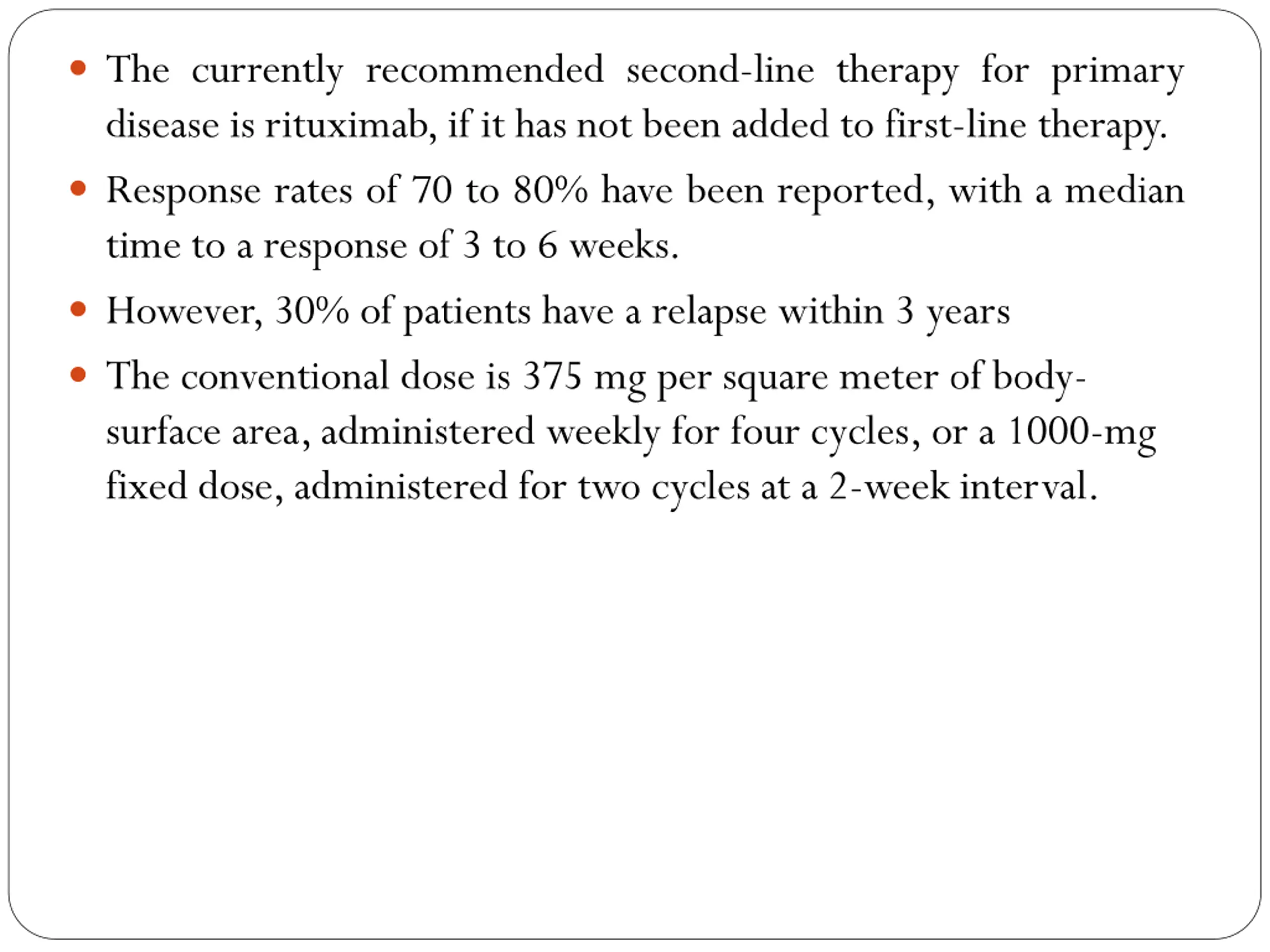 The currently recommended second-line therapy for primary disease is rituximab,if it has not been added to first-line therapy. Response rates of 70 to 80% have been reported, with a median time to a response of 3 to 6 weeks. However,30% of patients have a relapse within 3 years The conventional dose is 375 mg per square meter of body- surface area, administered weekly for four cycles, or a 1000-mg fixed dose, administered for two cycles at a 2-week interval.