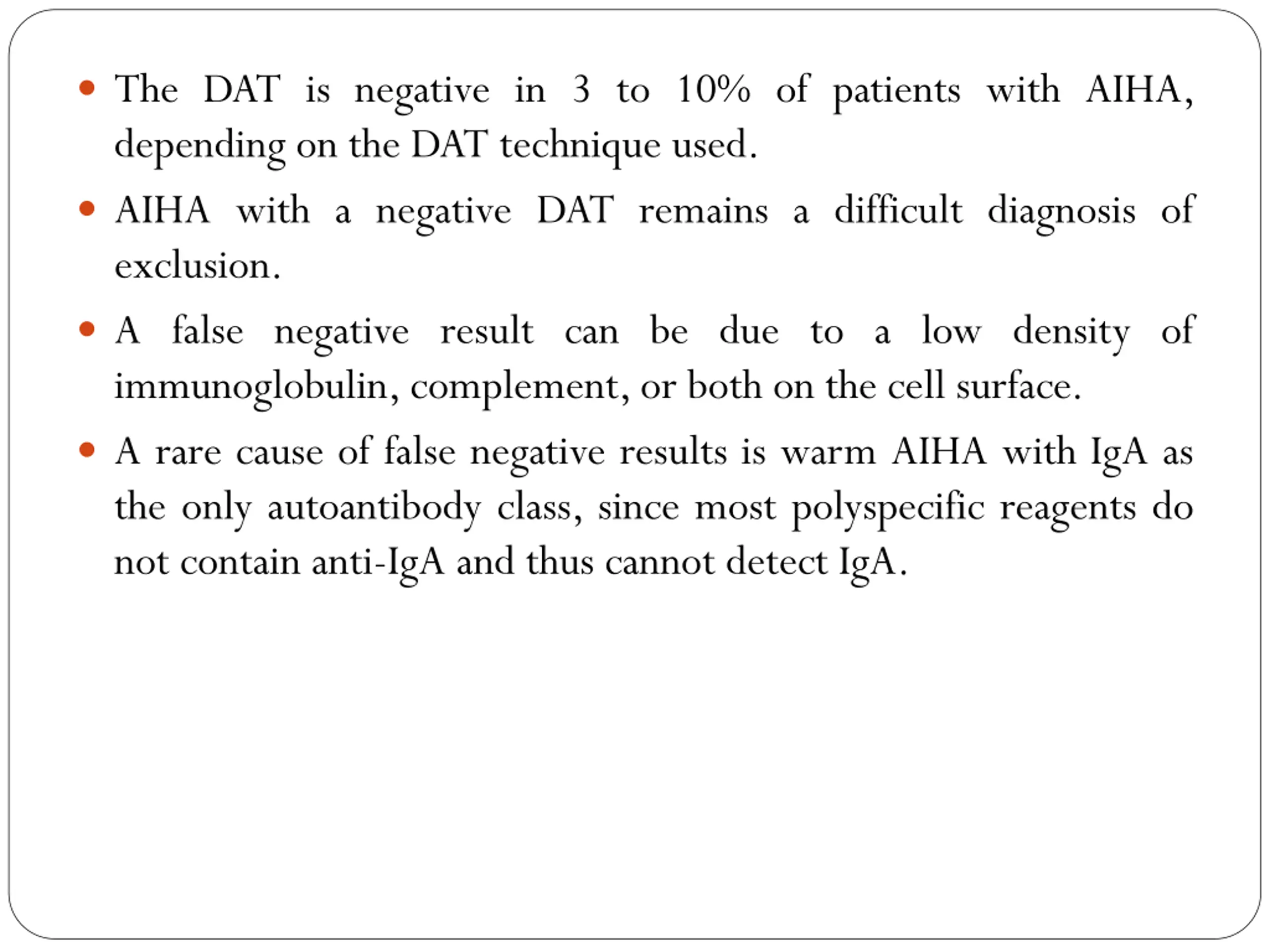 The DAT is negative in 3 to 10% of patients with AIHA, depending on the DAT technique used. AIHA with a negative DAT remains a difficult diagnosis of exclusion. A false negative result can be due to a low density of immunoglobulin,complement,or both on the cell surface. A rare cause of false negative results is warm AIHA with IgA as the only autoantibody class, since most polyspecific reagents do not contain anti-IgA and thus cannot detect IgA.